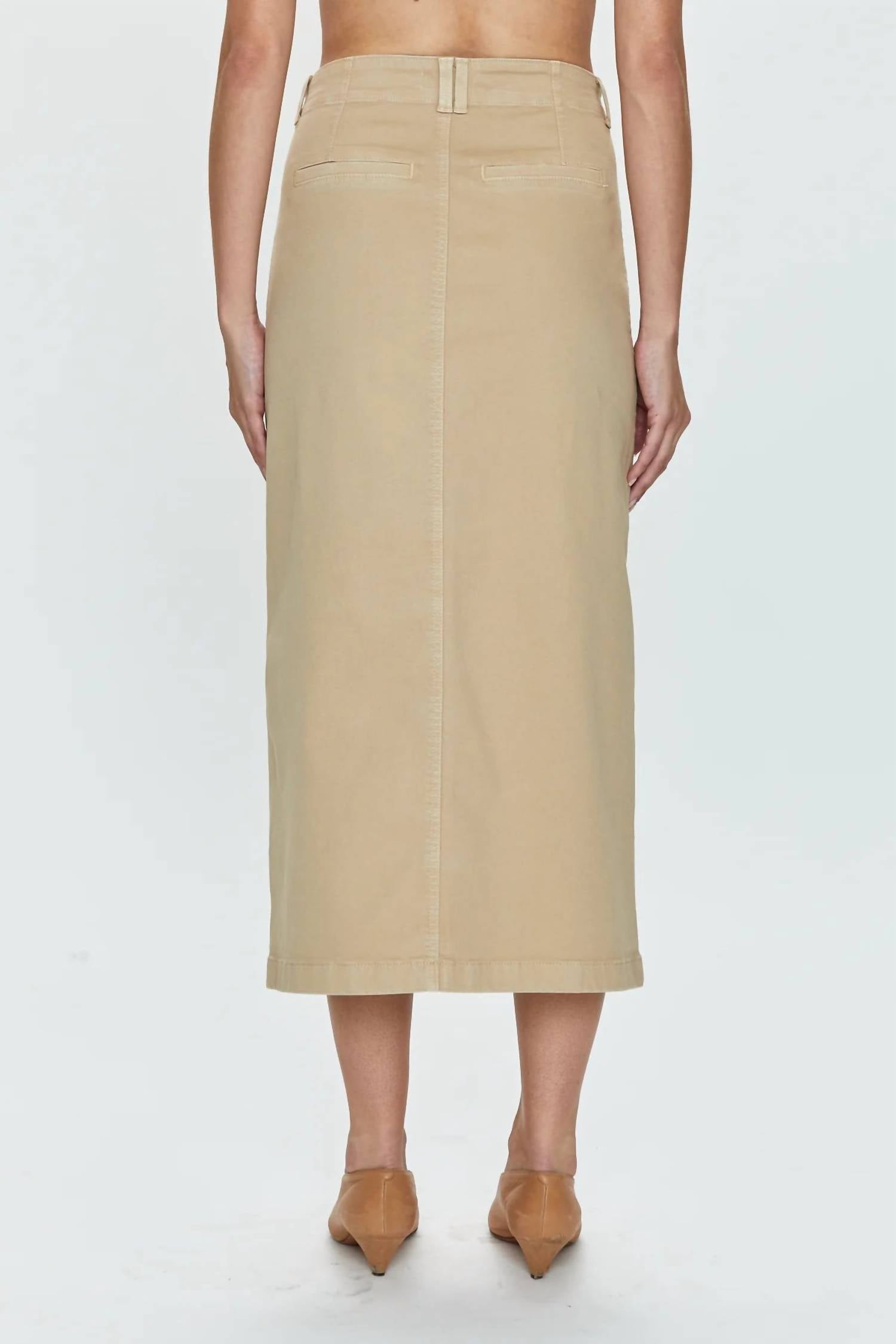 Tuck your favorite tee into this midi length skirt for an effortlessly cool look. Sophisticated piece in a timeless latte hue. Emphasizing comfort and style. Features a high-rise waist, utilitarian patch pockets, and a well-placed front slit to enhance movement. Made from a stretch blend of 98% cotton and 2% spandex. Measures 34 inches in length. Button closure. Machine wash, tumble dry. Model is 5'9" and wearing size 26, making it ideal for your next travel adventure.