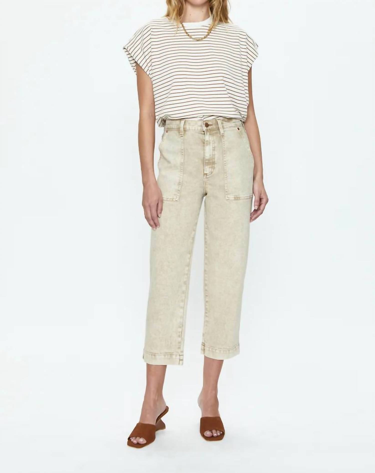 Introducing the Pistola Trina Muscle Tee, a must-have for your casual wardrobe in striking Sable Stripe. This tee features cropped cap sleeves, offering a fresh twist on the traditional muscle-tee look with a boxy, oversized fit. Crafted from 100% cotton, it promises lightweight comfort for everyday wear. With a pull-on closure and recommended dry clean care, this imported piece is perfect for summer, evoking a nostalgic 90s fashion appeal.