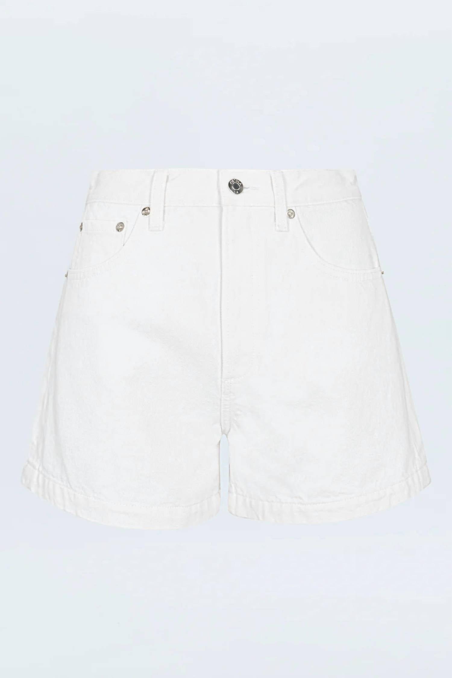 Introducing the Polished White Saige Shorts by PISTOLA, an ideal choice for adding timeless cool to your closet this summer. Designed from rigid, non-stretch denim, these jean shorts offer structure and maintain their shape throughout the day. Featuring a zip closure and clean finish hem, the shorts exude a polished and lived-in feel with their solid white wash. Care: Machine wash.