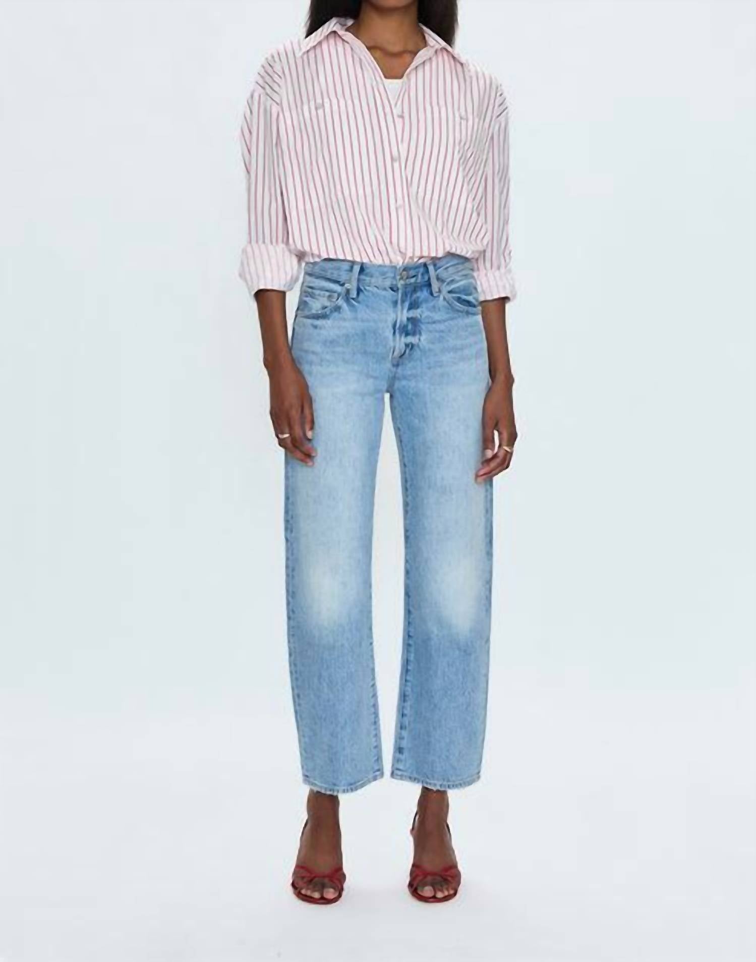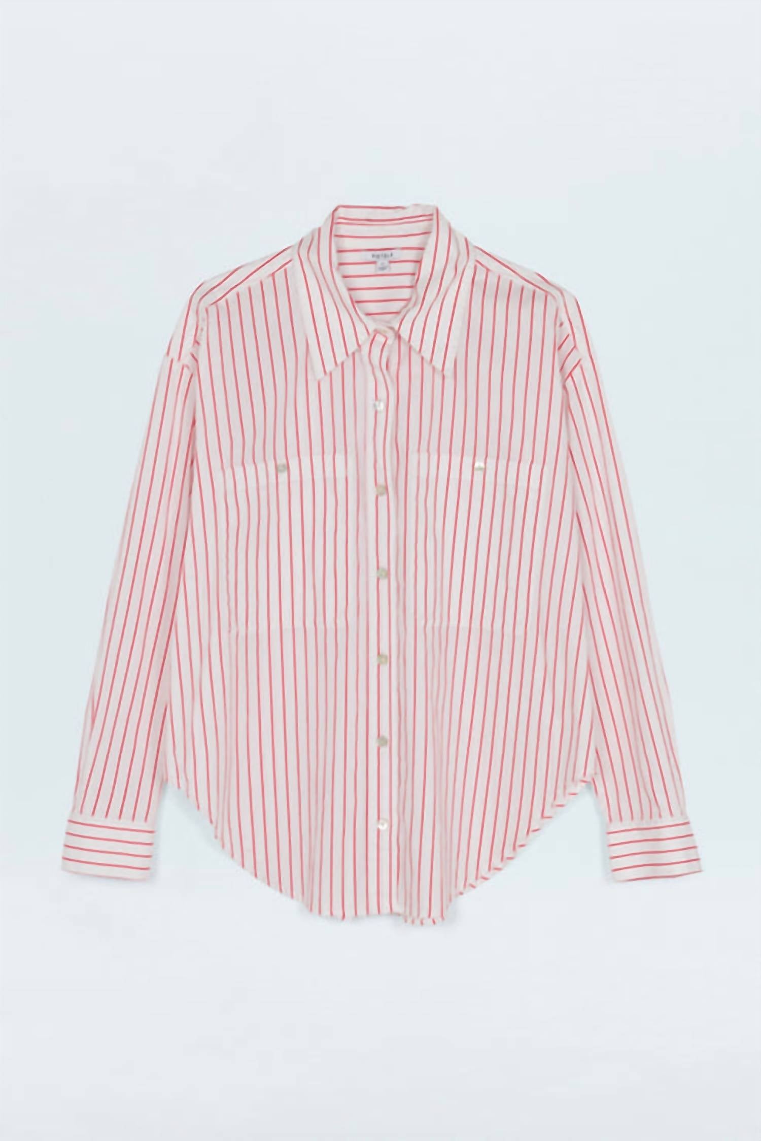 Perfectly tailored and soft to the touch. Discover the Samantha Oversized Button Up Shirt by PISTOLA, a chic addition to your wardrobe in the elegant Ruby Stripe pattern. With its long sleeves, collared neckline, and 28.5” length, this shirt offers a relaxed, boyfriend-inspired fit. Crafted from a blend of 55% cotton and 45% rayon for ultimate comfort, it features front button chest pockets and a button closure. Imported. Machine wash cold for best results. Model is 5’9” wearing a size small.