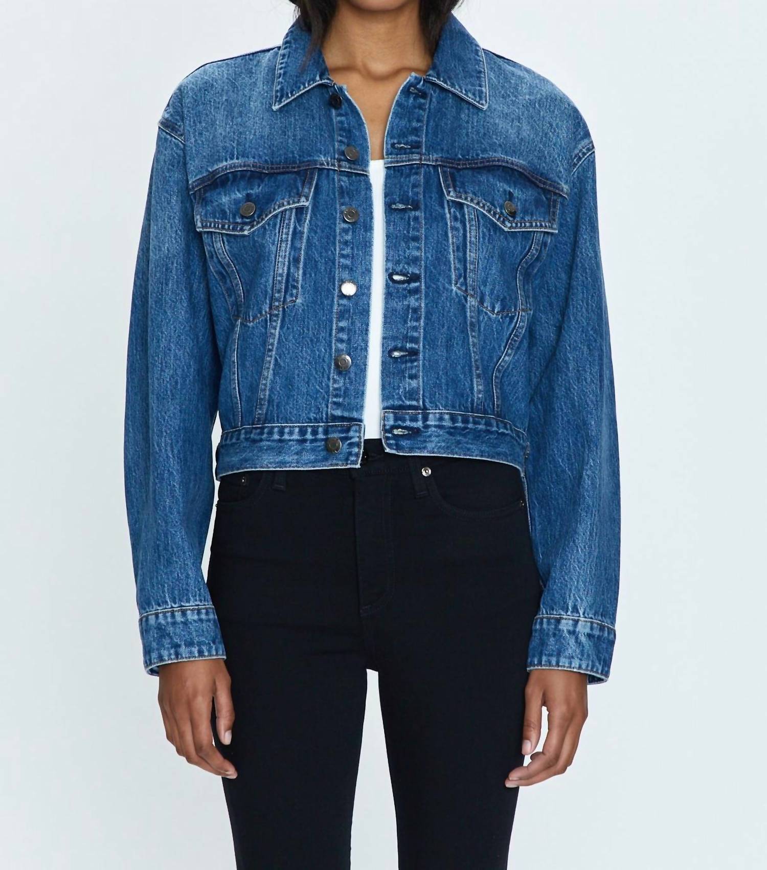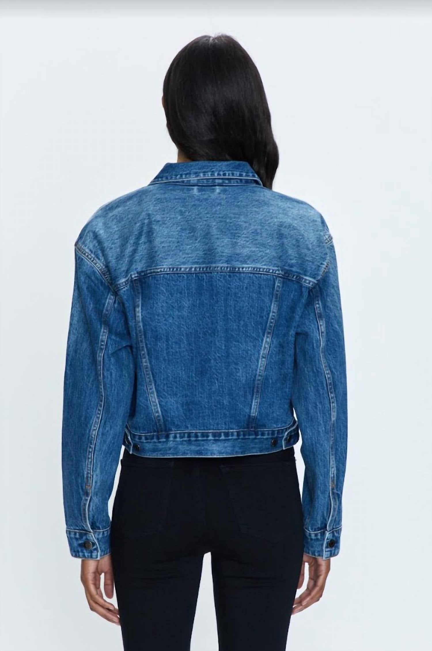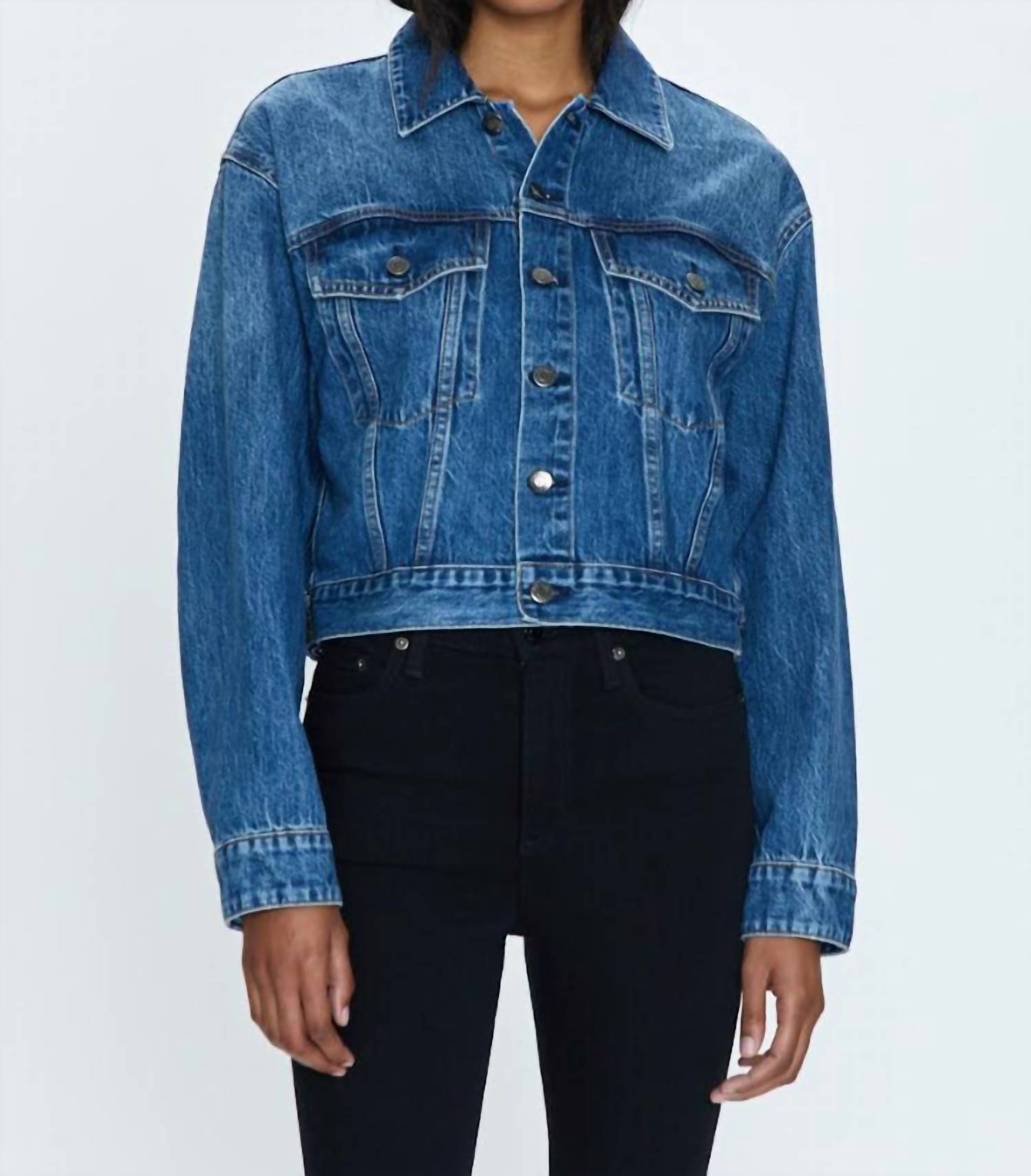 This utility jacket is the perfect combination of cool and feminine. This Cropped Trucker Jacket features a button closure, classic collar, and front pockets, made from 100% cotton for a stylish, functional look.