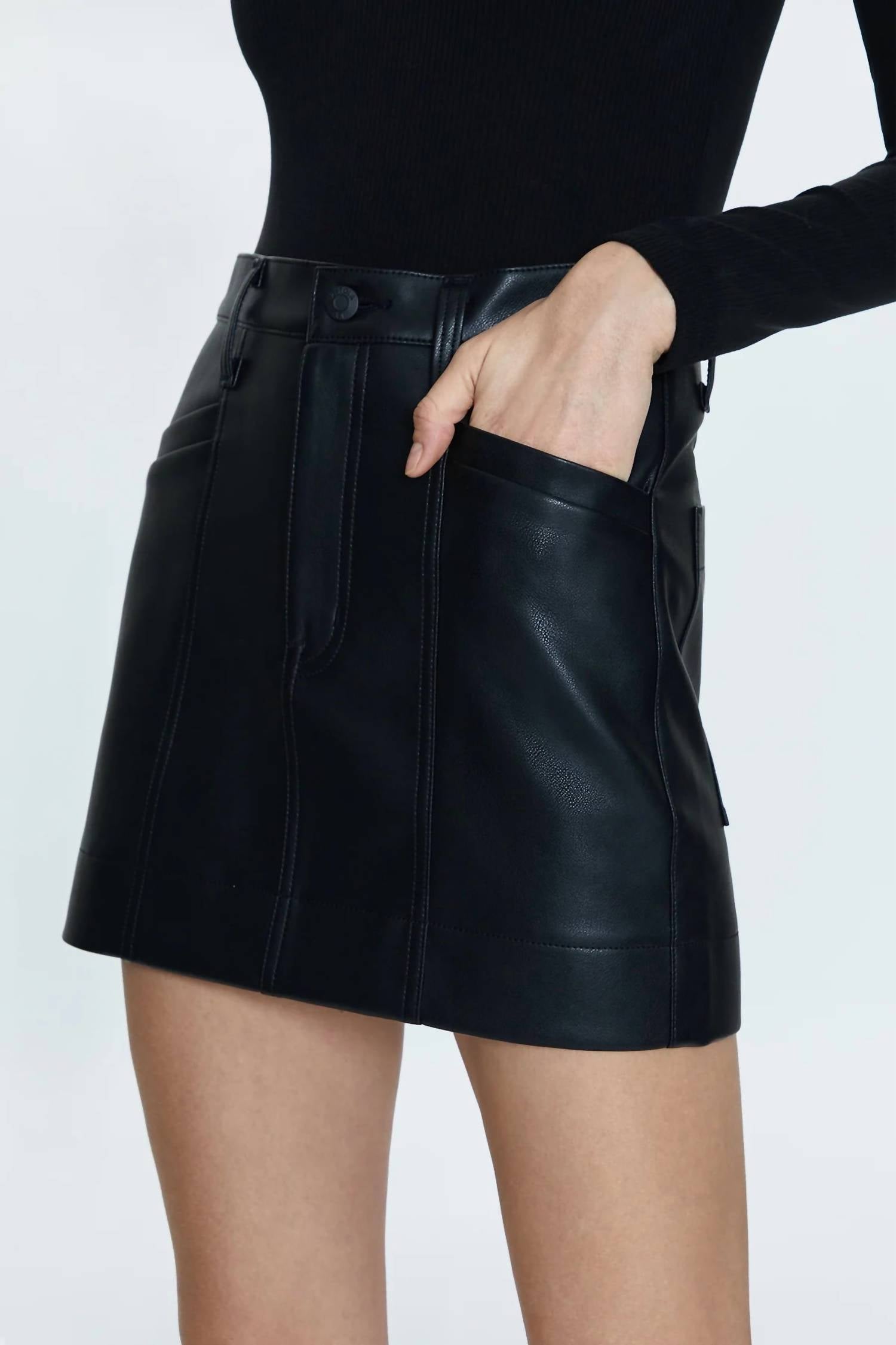 Tuck in your favorite tee for a more laid-back vibe. Meet the Tera High Rise Mini Skirt by PISTOLA, a stunning vegan leather piece that combines modern utilitarian design with front seaming details for a chic look. Crafted from 100% Polyurethane in a sleek slate black, this skirt is designed for a high rise fit with a 14.5” length. It features practical pockets and a button closure for added convenience. To ensure its longevity, please hand wash. The model is 5'9" and wearing a size 26.