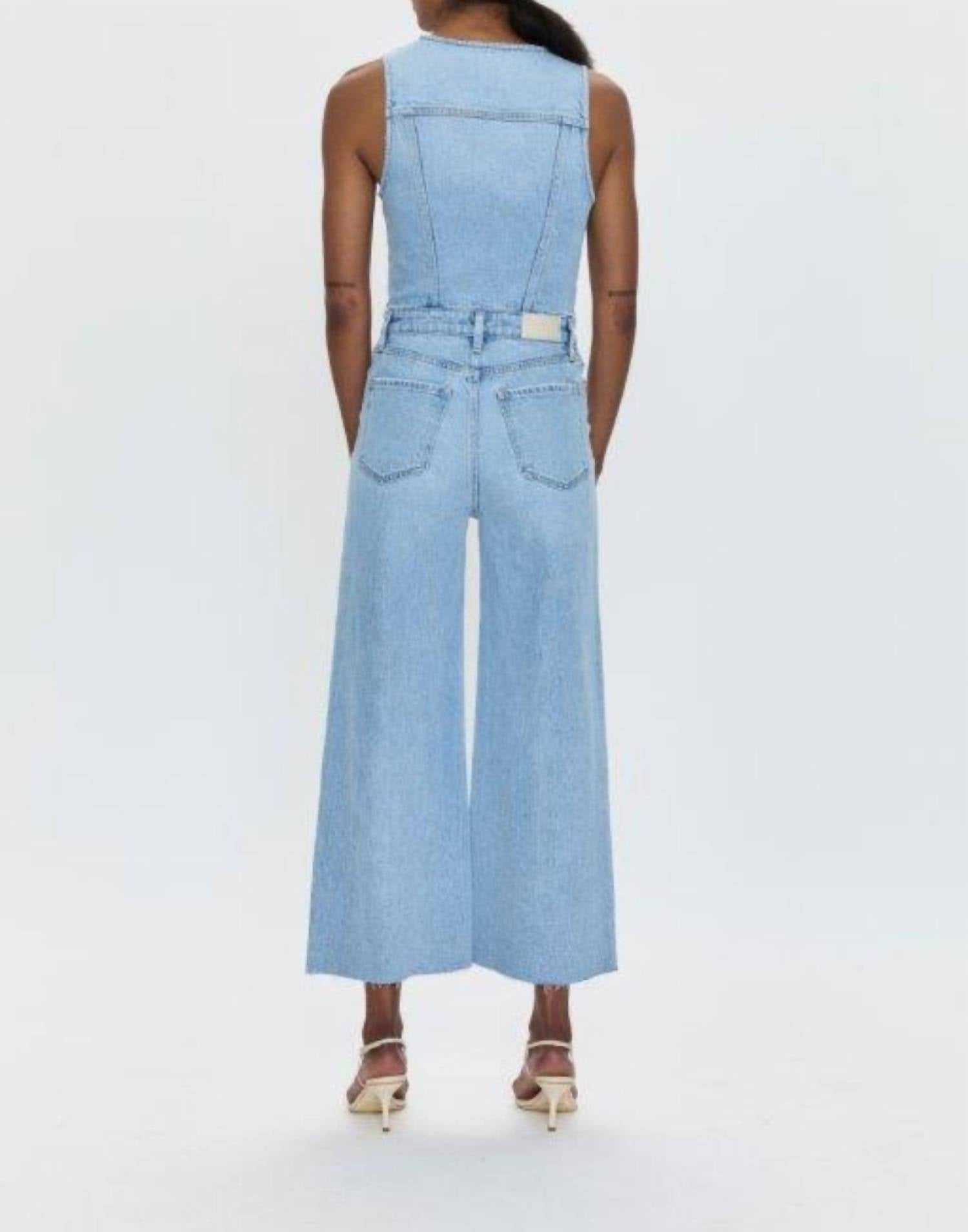 The perfect outfit choice when you you need something quick to throw on and still want to look efforlessly cool. Discover effortless elegance with the Women's Aria Cropped Jumpsuit by PISTOLA, designed for versatility and style. This sleeveless jumpsuit, made from premium denim, offers a flattering fit with its mid-rise waistline and wide-leg silhouette. Featuring a solid blue pattern and convenient pockets, it's perfect for vacation or streetwear looks. Closure: Button Closure. Care: Machine wash cold.