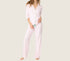 Experience the luxury of comfort with the Happiest On The Court Striped Pajama Set by PJ Salvage, ideal for cozy evenings. This loungewear set features a long-sleeve button-down top paired with tie-waist pants, both adorned with ivory and pink stripes and contrast pink piping, perfect for a stylish, relaxed look. Crafted from 95% polyester and 5% elastane in a heavy butter jersey, it ensures softness and a stretchy fit. Care instructions include machine washing cold and tumble drying low.