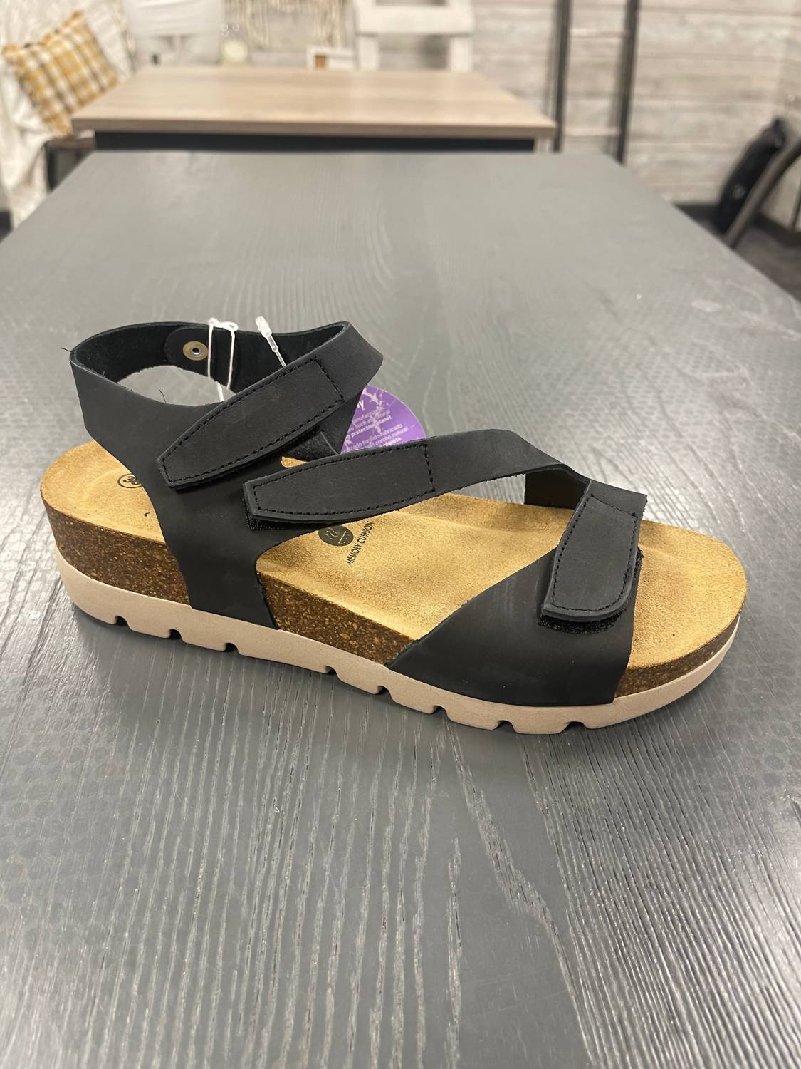 Flowy dresses, cropped pants, and even jumpsuits... this sandal works with them all! Enhance your summer wardrobe with the Women's Jane Sandal by Plakton, perfect for vacation with its minimalist design. These black sandals feature an adjustable hook-and-loop strap and are crafted from nubuck leather, ensuring comfort and durability. The approximate 1 1/2-inch wedge heel adds a stylish lift, while the natural cork footbed with memory cushion technology provides ultimate comfort. EVA outsole. Ideal for the spring and summer seasons with a round toe design.