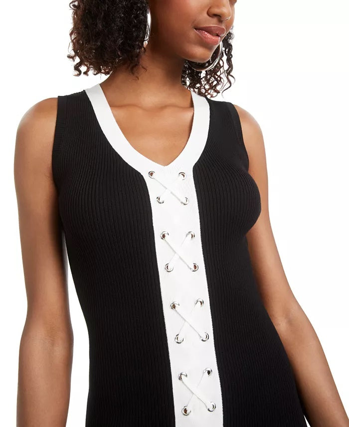 V-neck; Bodycon silhouette |Pull-on styling |Colorblocked design; lace-up detail with grommets at front