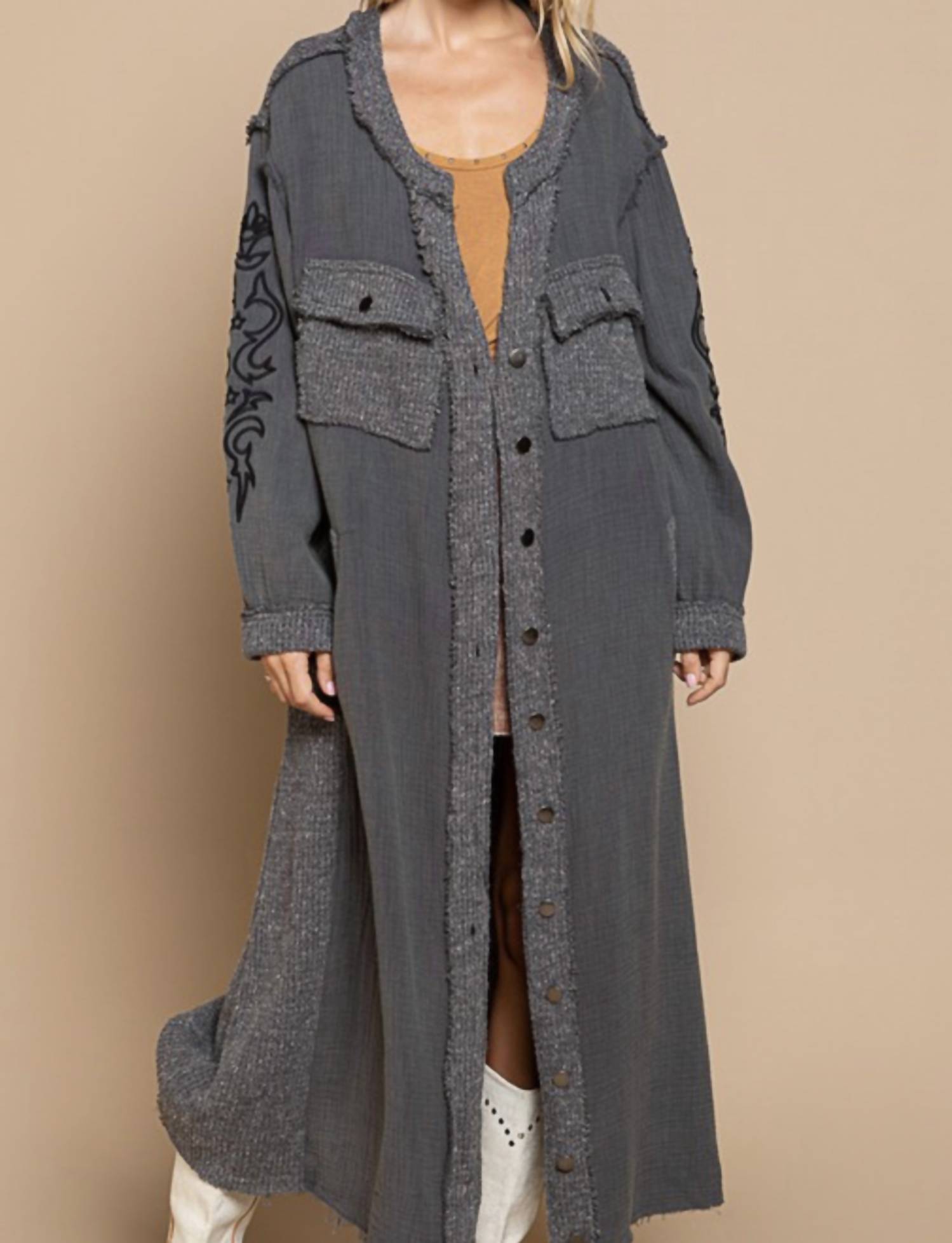 This long button-up duster in a deep charcoal grey offers a unique, laid-back boho style with contrasting textures and sleeve detailing.