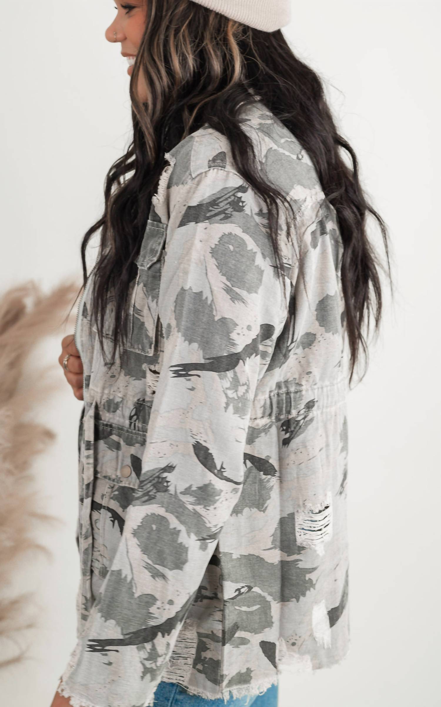 Classic, cool and works with almost any outfit choice. Embrace the timeless style of the Camo Twill Jacket by POL in an eye-catching vintage camo print. This women's jacket is crafted from 100% cotton, ensuring comfort with its relaxed fit and long sleeves. Featuring practical pockets and a convenient zip closure, this piece is both functional and stylish. Care for it by hand washing cold to maintain its quality.