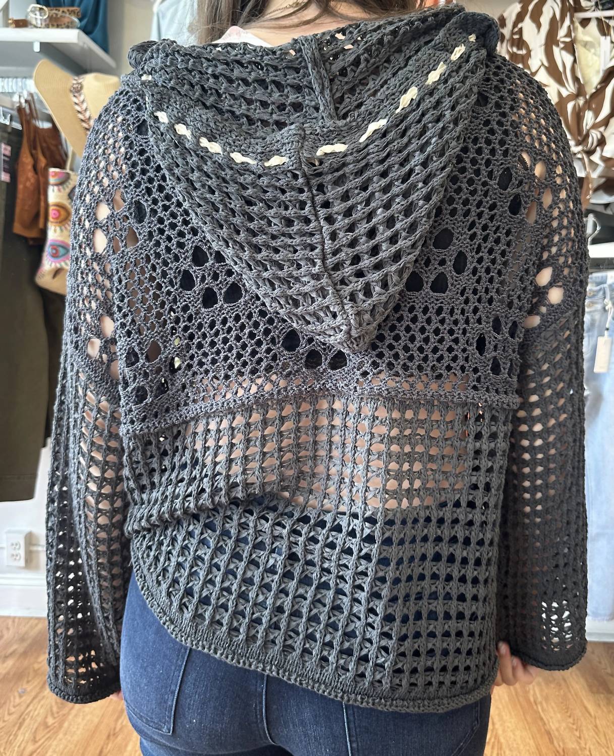 Whether you're running around town or lounging at home, this sweatshirt works for both. Embrace casual charm with the POL Crochet Hoodie Sweater in a rich charcoal shade, perfect for relaxed summer outings. This long-sleeve hoodie, crafted from 100% cotton, features an open-knit design that is both breathable and stylish. It’s highlighted by a contrasting ivory crochet kangaroo pocket and tie closure, adding a unique touch. Care: Hand wash cold and lay flat to dry. Model is 5'9" wearing a medium.