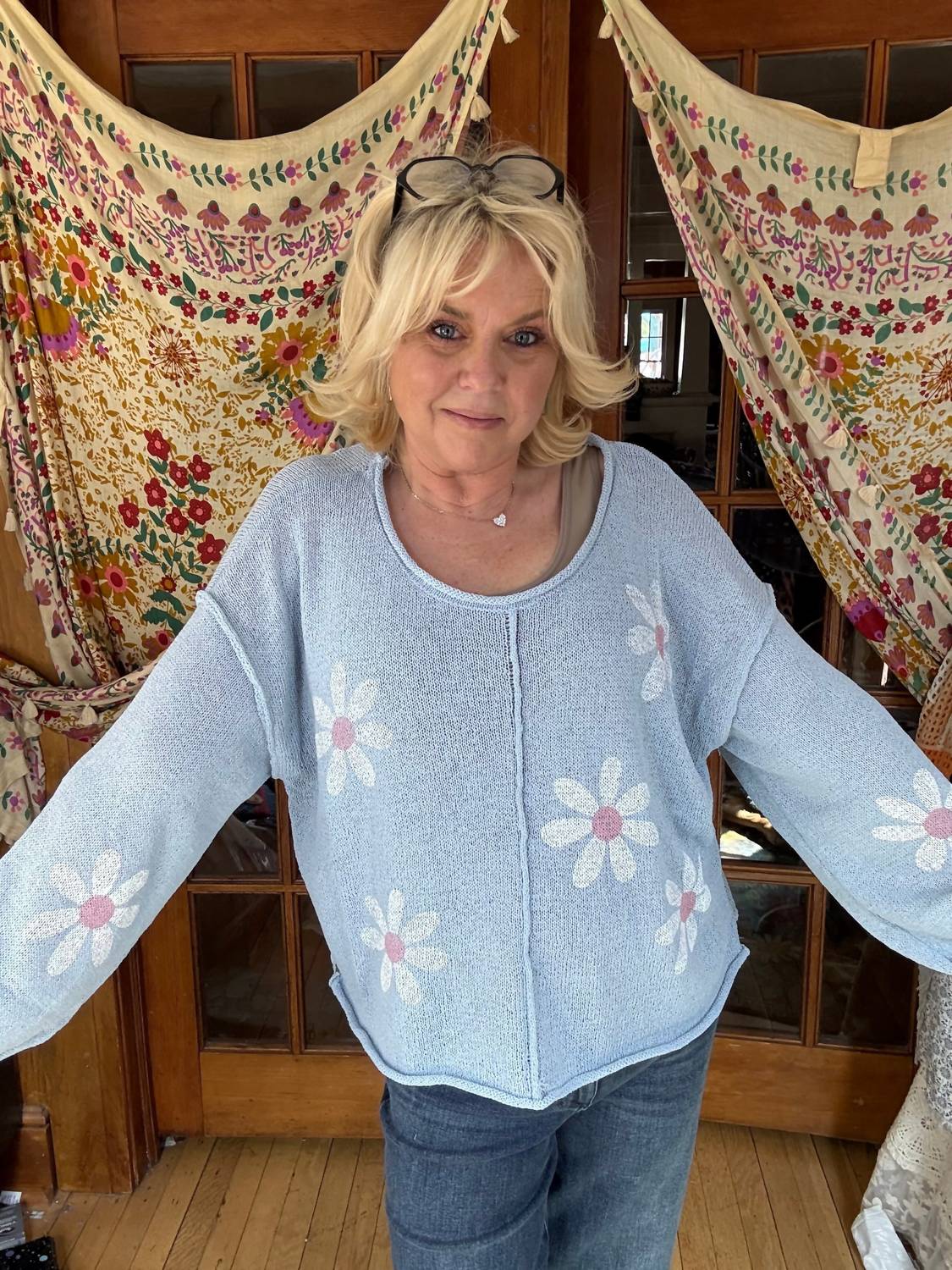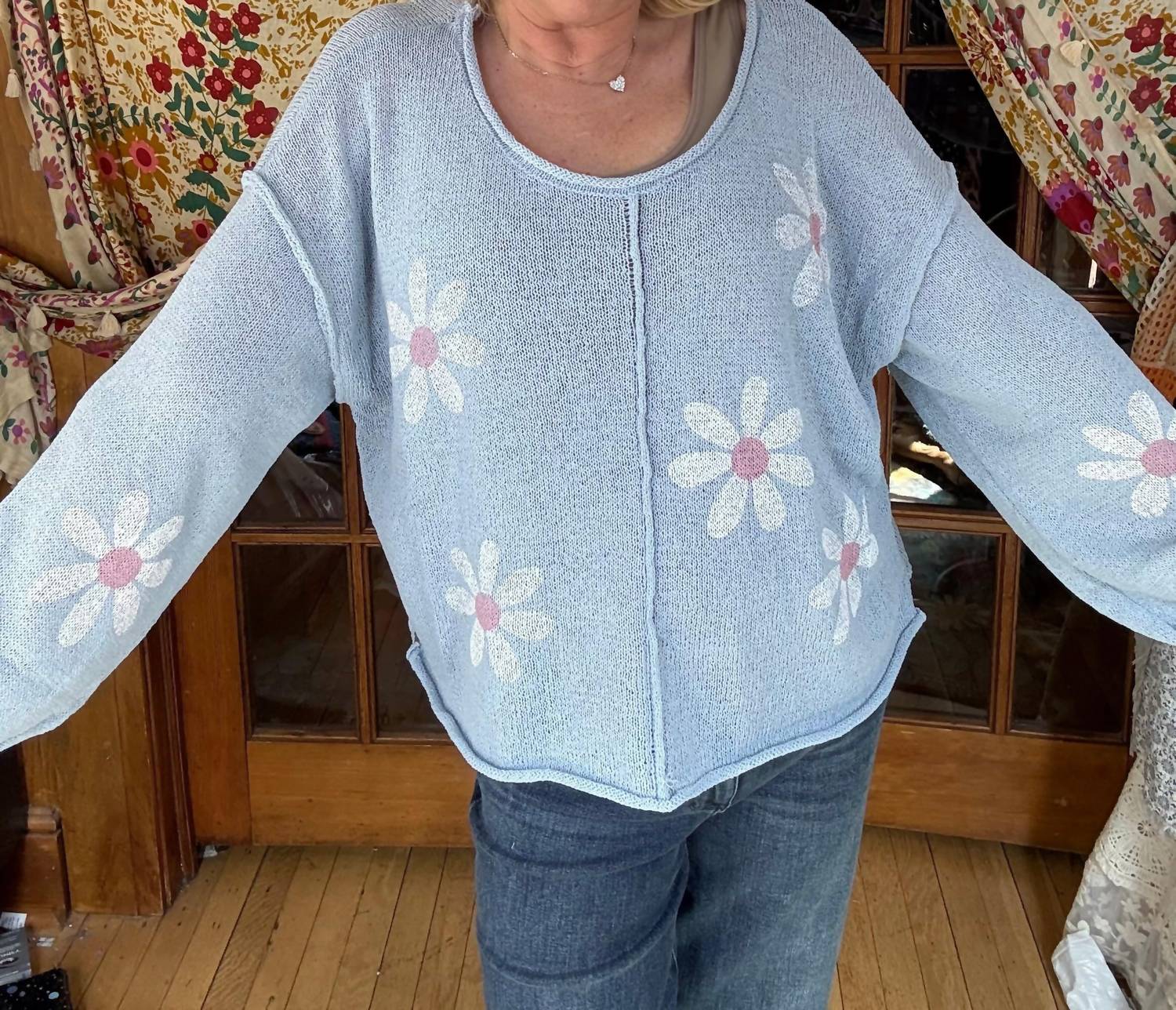 Pair this with your favorite jeans and slides for your next girls night out. Elevate your wardrobe with the Daisy Lightweight Sweater by POL, offering a whimsical touch in a charming light blue hue. This long sleeve sweater boasts a delicate floral design and a relaxed fit, made from 78% Acrylic and 22% Polyester for soft, breathable comfort. Measuring 25.5 inches in length for sizes S to L, and featuring a boatneck silhouette, it provides a laid-back yet stylish look. Care: Machine wash cold gentle cycle, lay flat to dry, cool iron if needed, do not bleach.