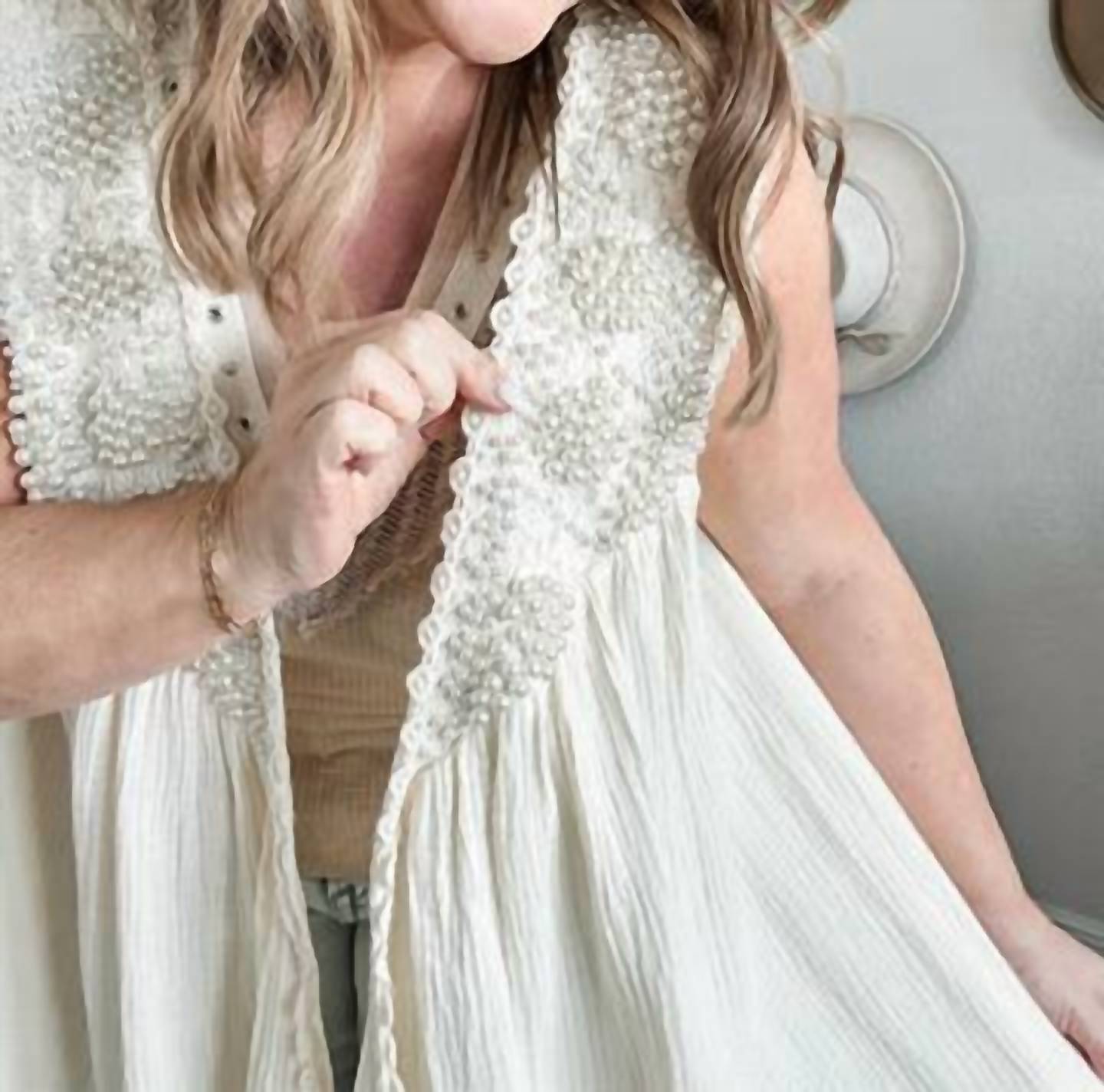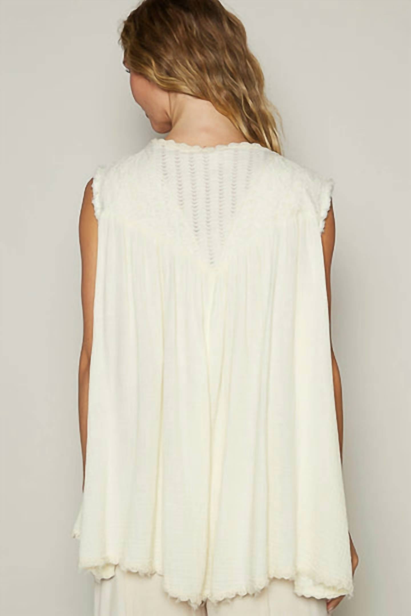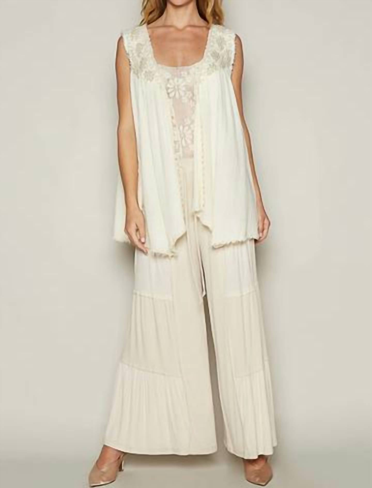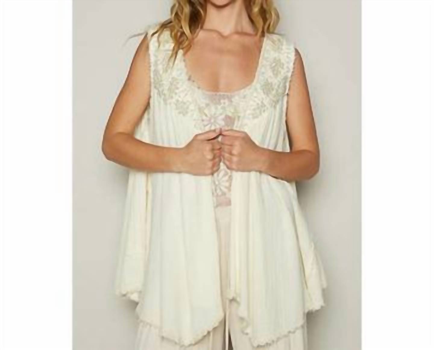 That extra layering piece you didn't know you needed! Revamp your summer wardrobe with the cream "Dancing In The Rain" vest by POL, a perfect blend of style and comfort. This sleeveless vest is crafted from 100% cotton and features intricate lace detailing, making it an elegant choice for layering. It offers a breezy vibe with its open-front, pull-on design and crewneck, ideal for casual outings or a day at the church. Available in sizes S to L, with measurements ensuring a perfect fit: S (Shoulder 15", Bust 26", Length 29"), M (Shoulder 15.5", Bust 27", Length 30.5"), L (Shoulder 16", Bust 27.5", Length 30.5").