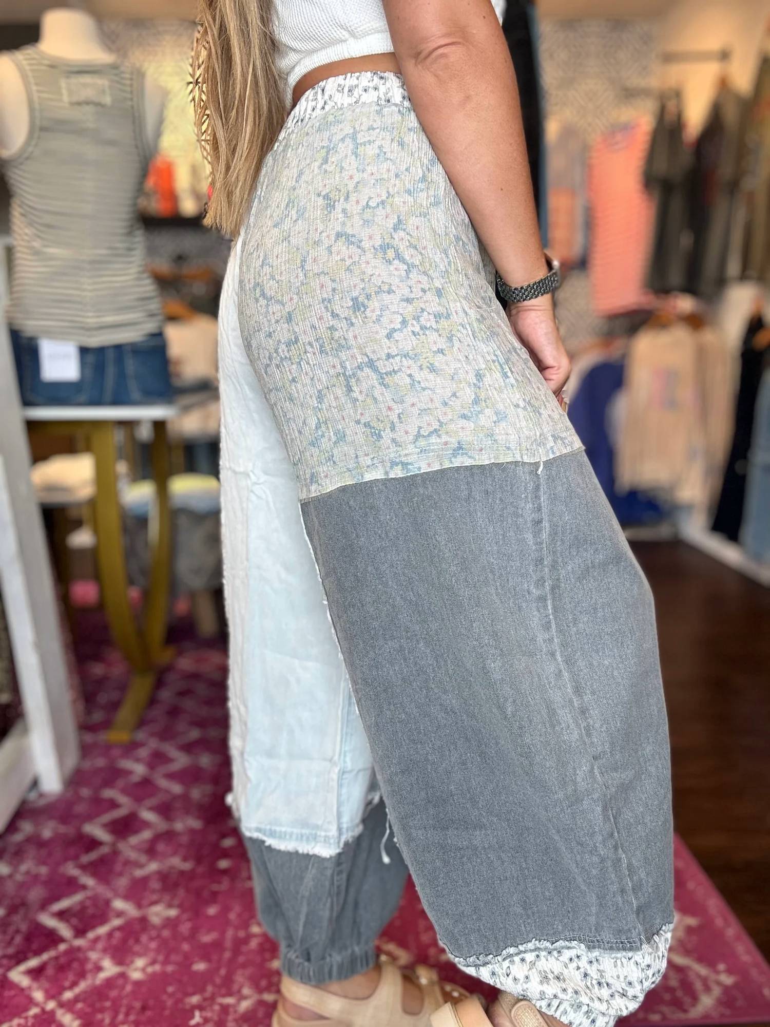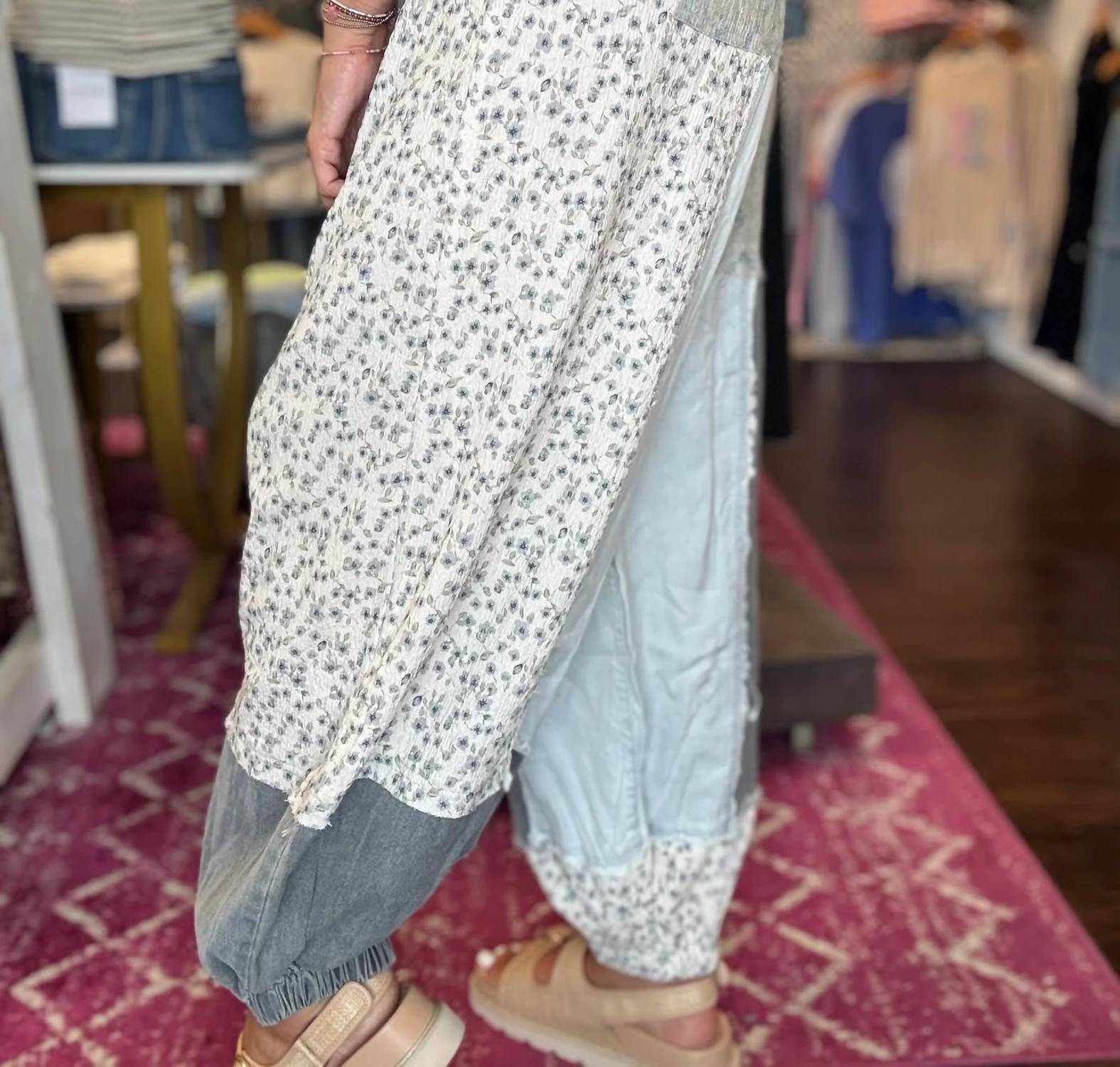 Pair these with your favorite sneakers for an effortlessly cool look. Elevate your casual wardrobe, offering a fresh boho twist. Made from 100% cotton. With delicate floral patchwork, and feature a high-rise and tapered leg for a flattering fit. With a pull-on elastic waistband and a 13.5-inch rise, ensure all-day comfort, complemented by a 27.5-inch inseam. Machine washable and tumble dry friendly, making them an effortless choice for laid-back outings. Model is 5'4" and wears a size small 4.