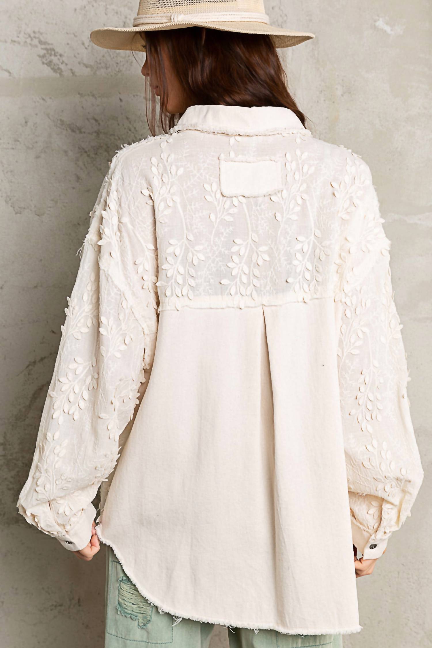 A casual yet cool jacket that every closset needs. Introducing the Relaxed Fit Embroidered Texture Jacket by POL, an elegant choice for transitional seasons. Crafted from breathable cotton, it features long sleeves and a textured floral detail in a natural cream shade. The jacket is designed with a button-front closure and a stylish hi-low hemline, ensuring both comfort and sophistication. With a practical collar and functional pockets, this casual jacket elevates your wardrobe effortlessly.