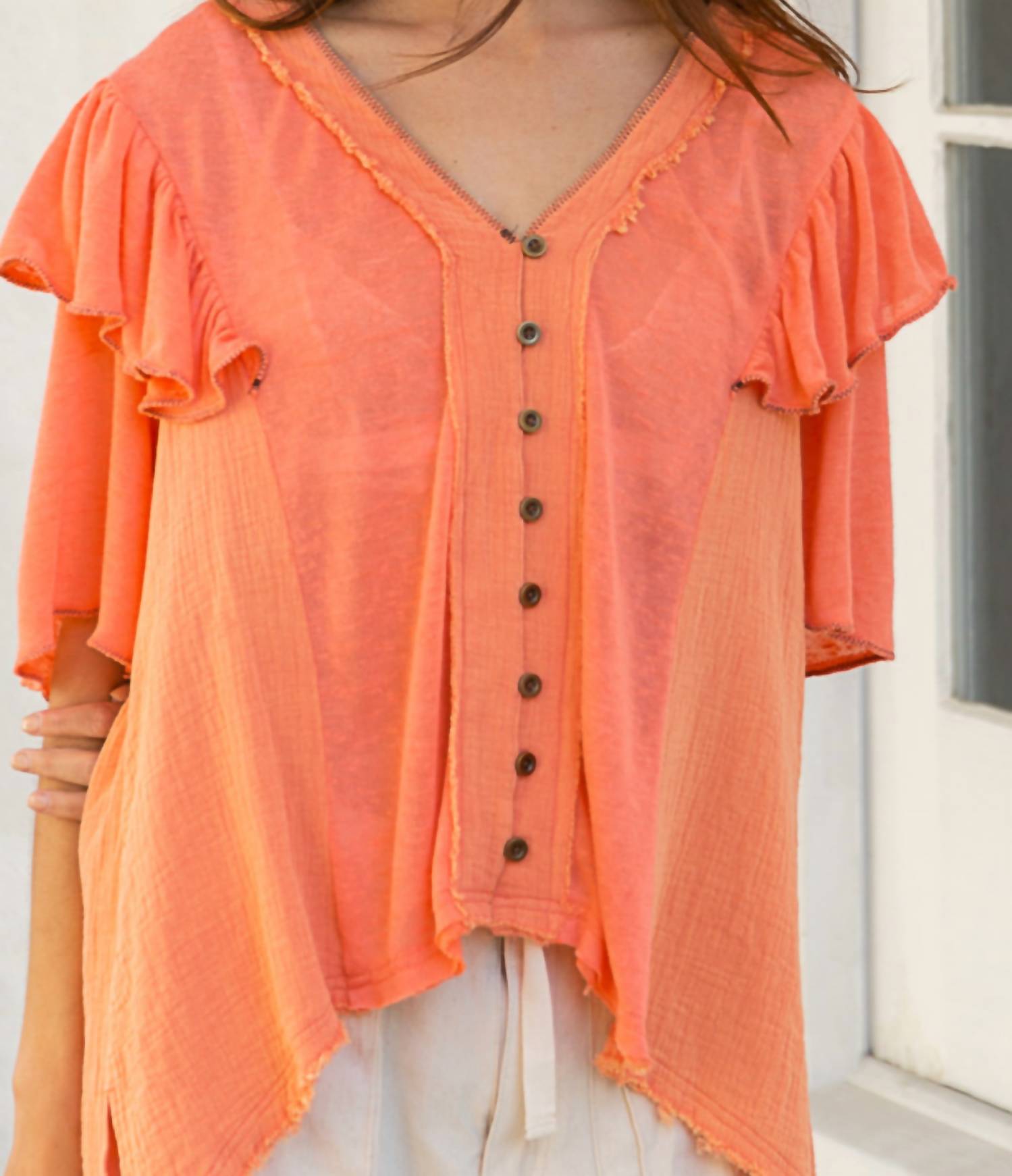 A timeless blouse that will never go out of style.Brighten up your wardrobe with this playful coral top, featuring charming ruffled sleeves and a button-down front. The frayed edges and lightweight fabric make it perfect for a casual day out, while the loose fit adds a touch of relaxed elegance.