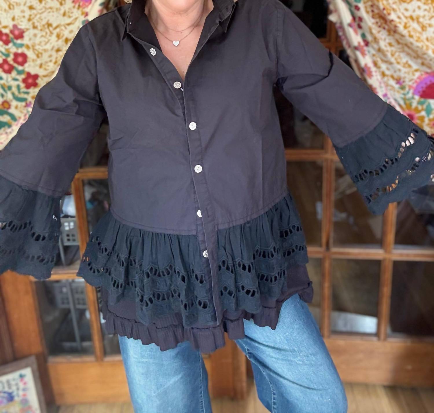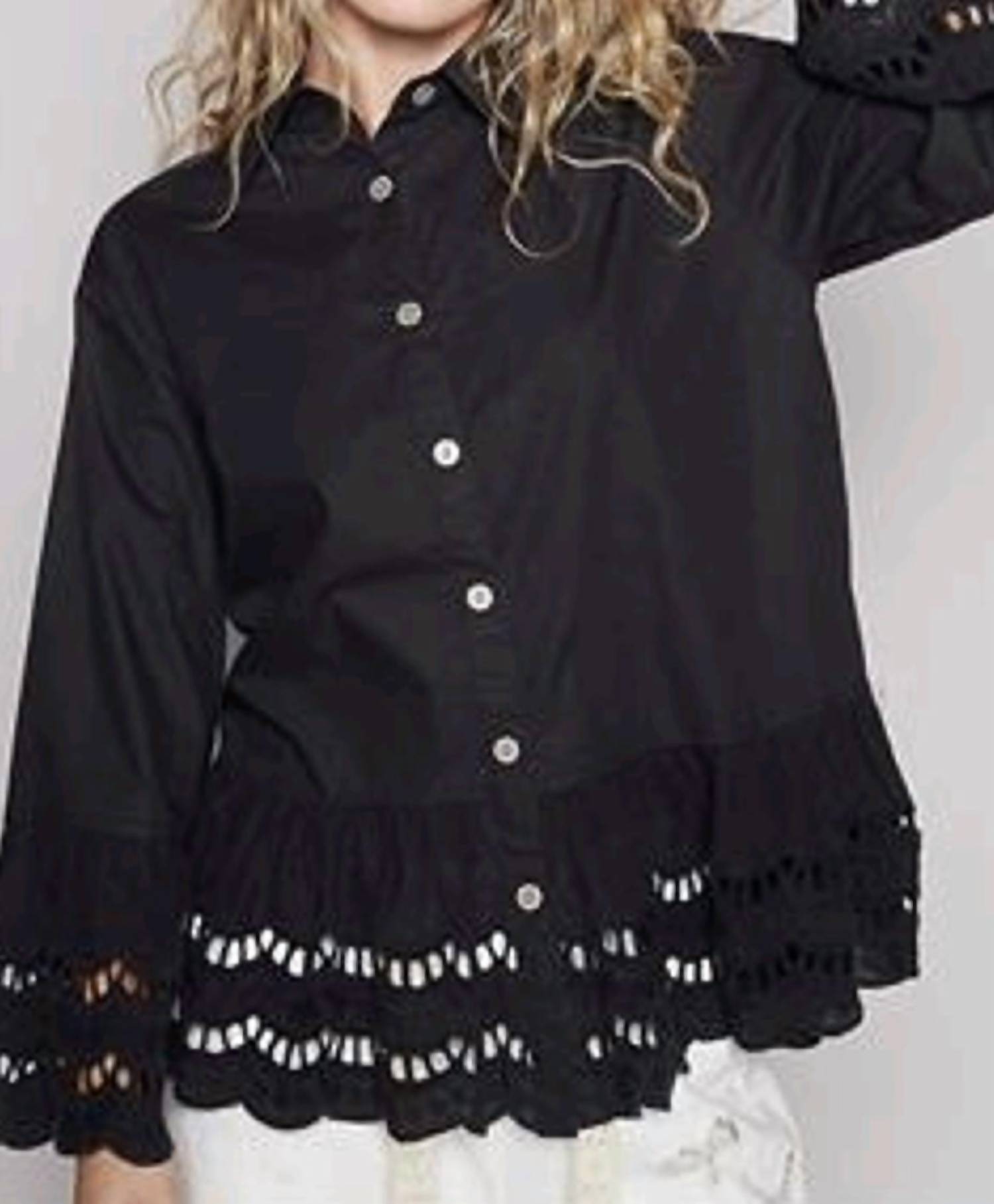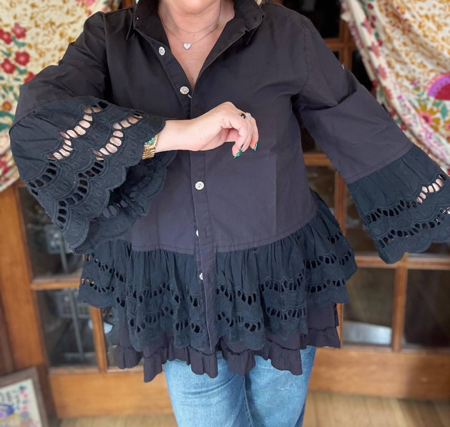 Pair this with your favorite jeans and slides for your next girls night out. Introducing the In Theory Cut Out Top by POL, an elegant black blouse that effortlessly elevates any wardrobe. With long sleeves adorned in intricate lace and a button-down front, it offers a sophisticated yet playful appeal. This blouse is crafted from 100% cotton for comfort and breathability. Available in different sizes with dimensions as follows: Size S - Shoulder 17.5", Bust 22", Length 27", Sleeve 21", Size M - Shoulder 18", Bust 22.5", Length 27.5", Sleeve 21", and Size L - Shoulder 19", Bust 23", Length 27.5", Sleeve 21".