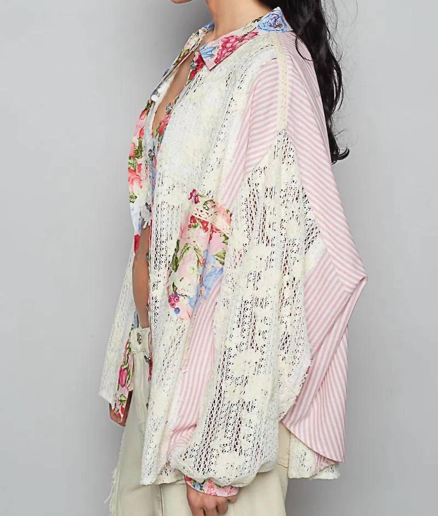 Pair this with your favorite jeans and slides for your next girls night out. The Lace Long Sleeve With Floral And Striped Pattern Top by POL is a charming addition to your summer wardrobe. Crafted from a cotton blend, this pink striped blouse features short sleeves and a trendy collar neckline, perfect for a maximalist vacation style. Designed with convenient pockets and a secure button closure, it combines practicality with elegance. For care, hand wash and lay flat to dry to maintain its vibrant pattern.
