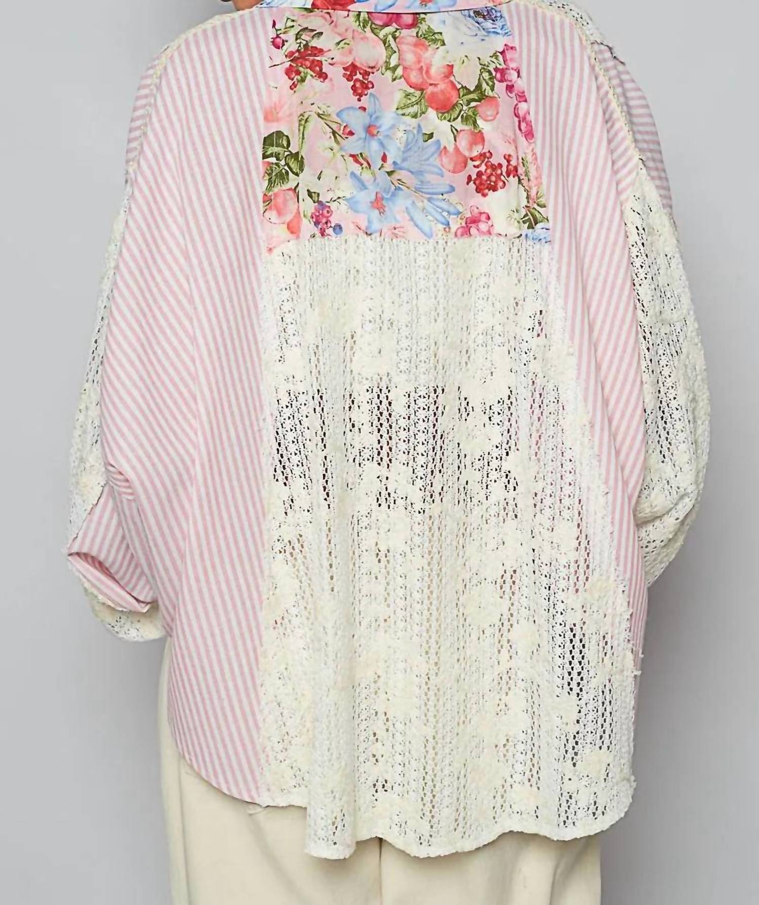 The Lace Long Sleeve With Floral And Striped Pattern Top by POL is a charming addition to your summer wardrobe. Crafted from a cotton blend, this pink striped blouse features short sleeves and a trendy collar neckline, perfect for a maximalist vacation style. Designed with convenient pockets and a secure button closure, it combines practicality with elegance. For care, hand wash and lay flat to dry to maintain its vibrant pattern.