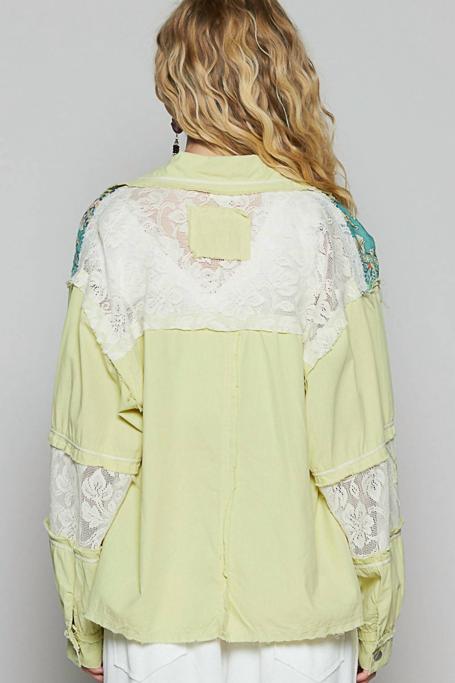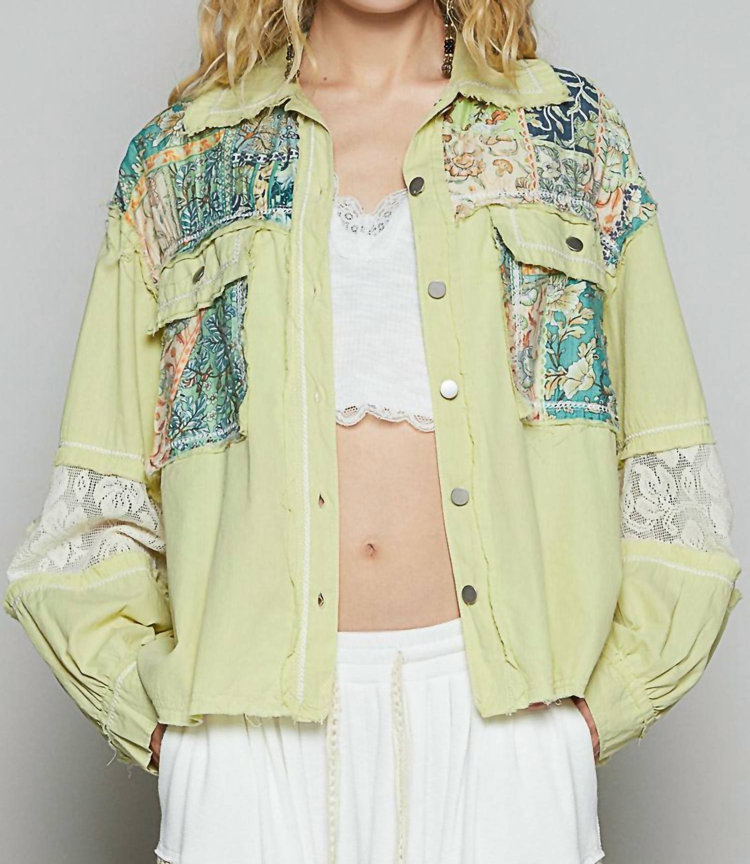 Effortlessly chic piece in Pale Lime Multi. Combines denim with a printed woven mix, featuring long, slightly ballooned sleeves and raw edge detailing. Composition is 100% cotton, offering a lightweight garment with a 25" length. Button closure, and convenient pockets. Collar neckline. Machine wash.