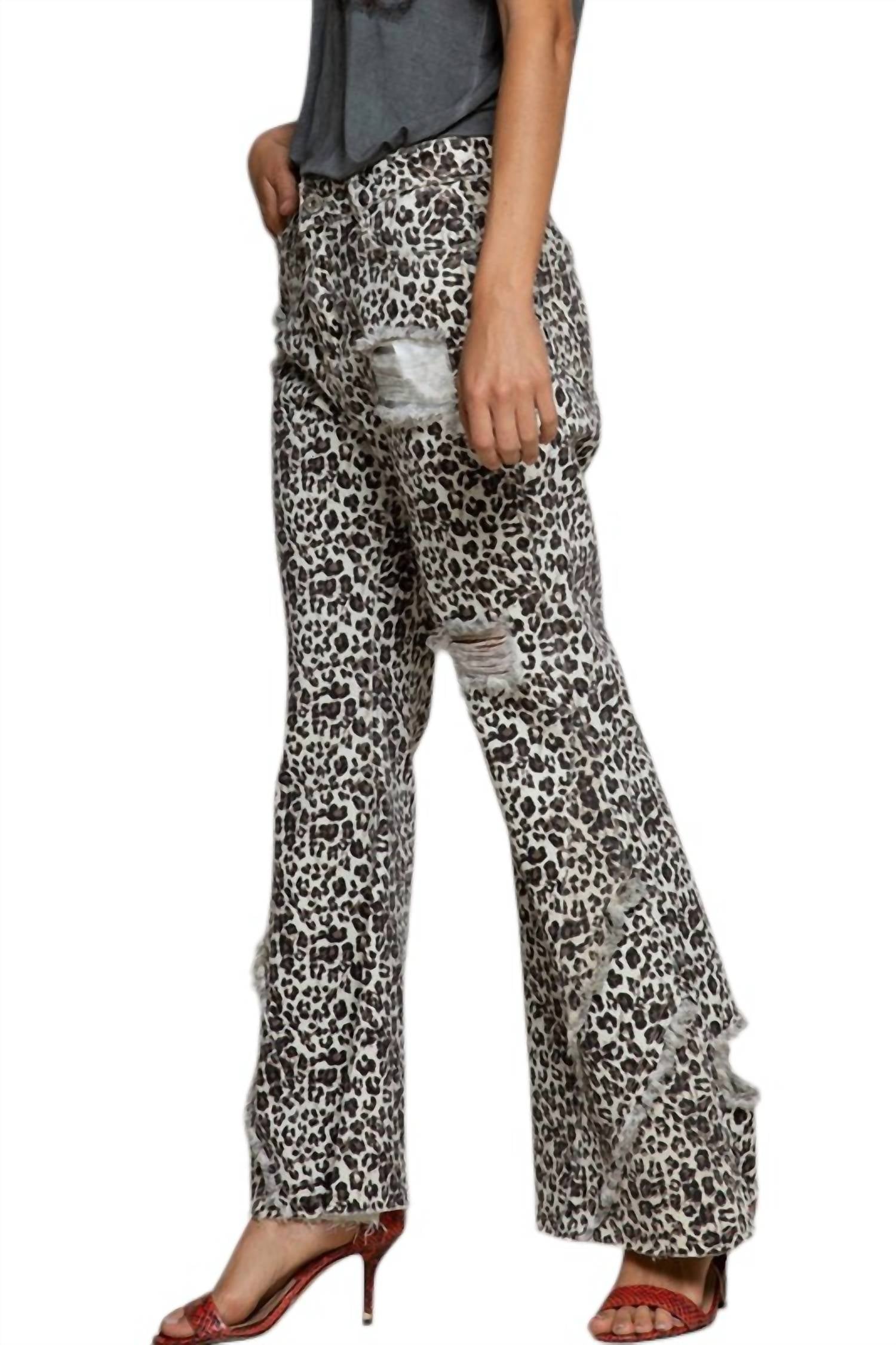 Pair these wide leg jeans with mules, slides or your favorite strappy sandals.These leopard flare jeans are a must-have for anyone who loves bold fashion. With a retro-inspired flare and a playful mix of animal prints, they bring a fun twist to your wardrobe. The high waist and relaxed fit add comfort, while distressed details and raw edges give them a stylish, edgy vibe. Pockets on the front and back make them practical, and the diagonal raw seam design adds a unique touch. Pair them with a classic sweater or a basic top for an effortlessly chic look. Made from 100% cotton.