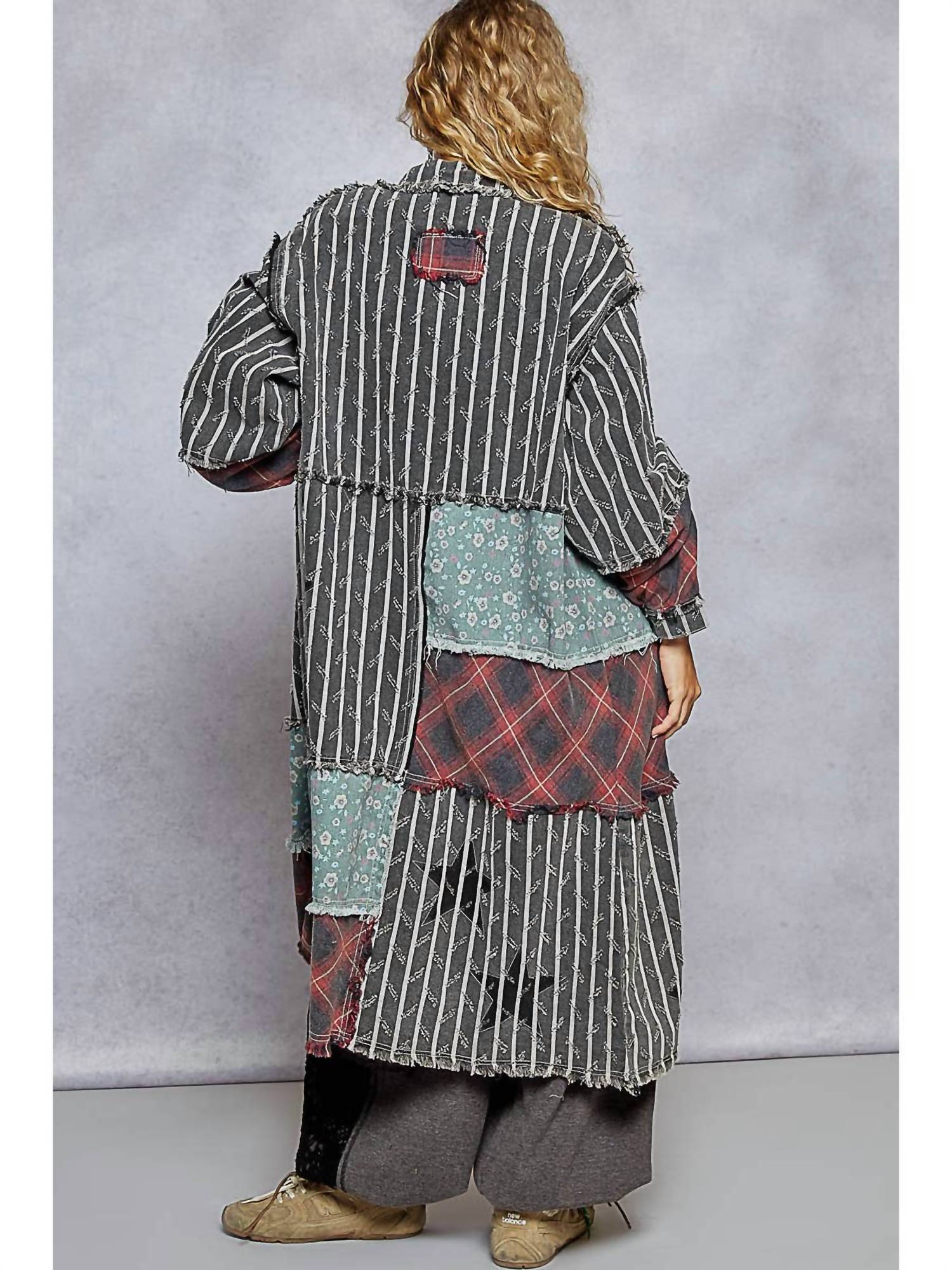 A timeless classic. You'll be reaching for this trench every season. This relaxed-fit jacket-style top features balloon sleeves and a unique mix of floral and striped patterns. Crafted from twill fabric, it’s designed with raw edge detailing for a casual, lived-in look. A versatile piece that blends structure with soft, effortless style.