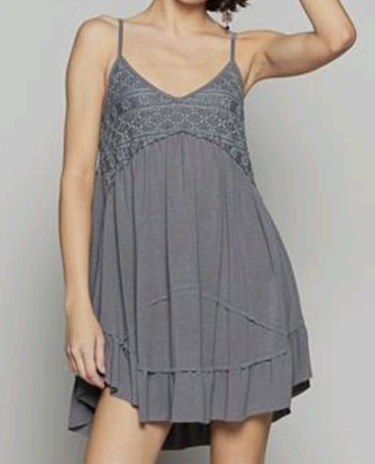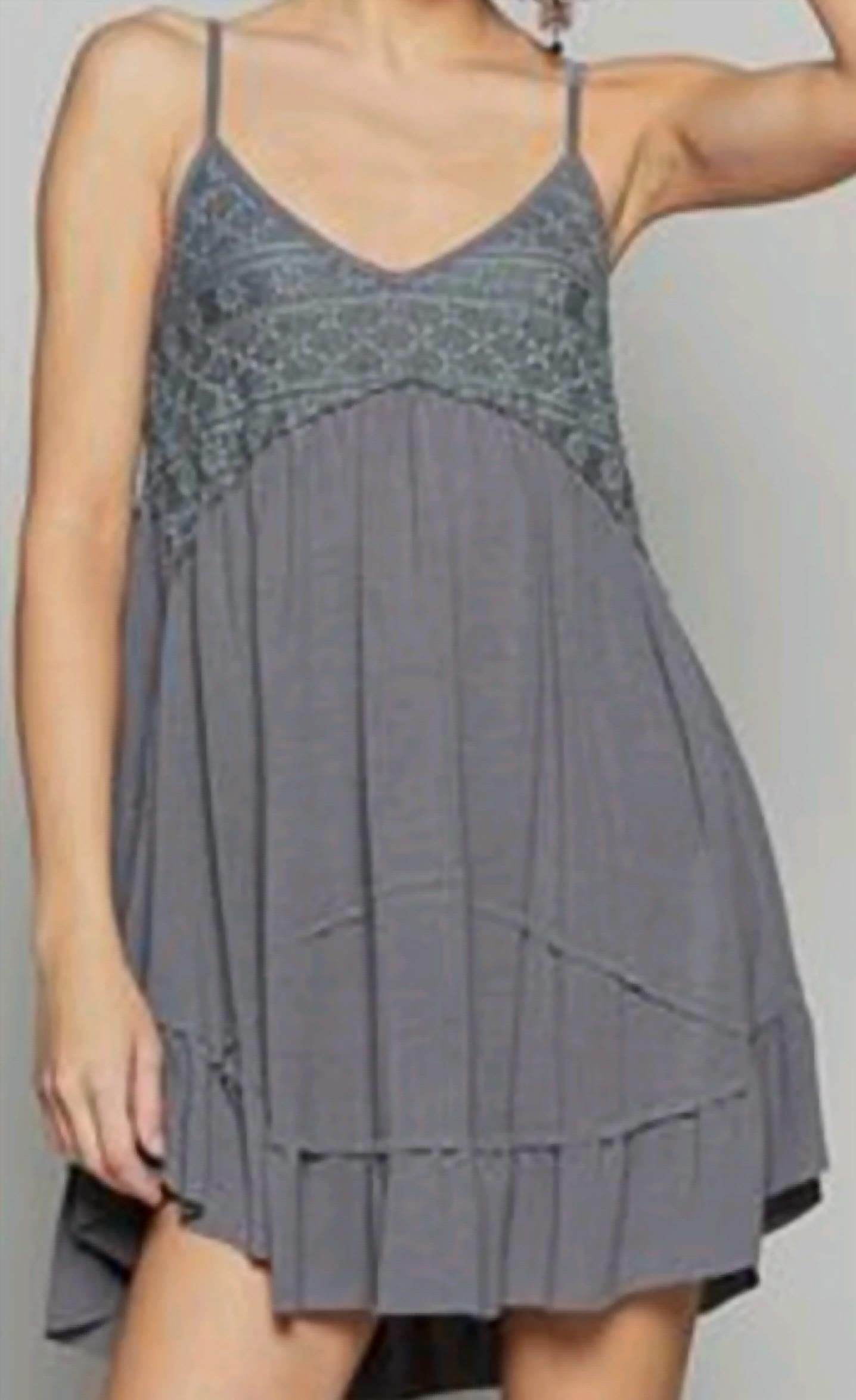 A short and breezy dress for those warmer days. Introducing the Iron Charcoal Mini Dress by POL, an elegant choice for summer vacations. This women's A-line sundress in gray boasts spaghetti straps and a flattering V-neckline, enhanced with intricate embroidery. Crafted from 95% Polyester and 5% Spandex with a contrasting 90% Cotton and 10% Spandex, it offers a relaxed fit with a bust measurement of 17" for size S, extending to 19" for size L, and a generous length that promotes comfort. Perfect for pairing with sandals for a casual day out or accessorizing for an evening look.
