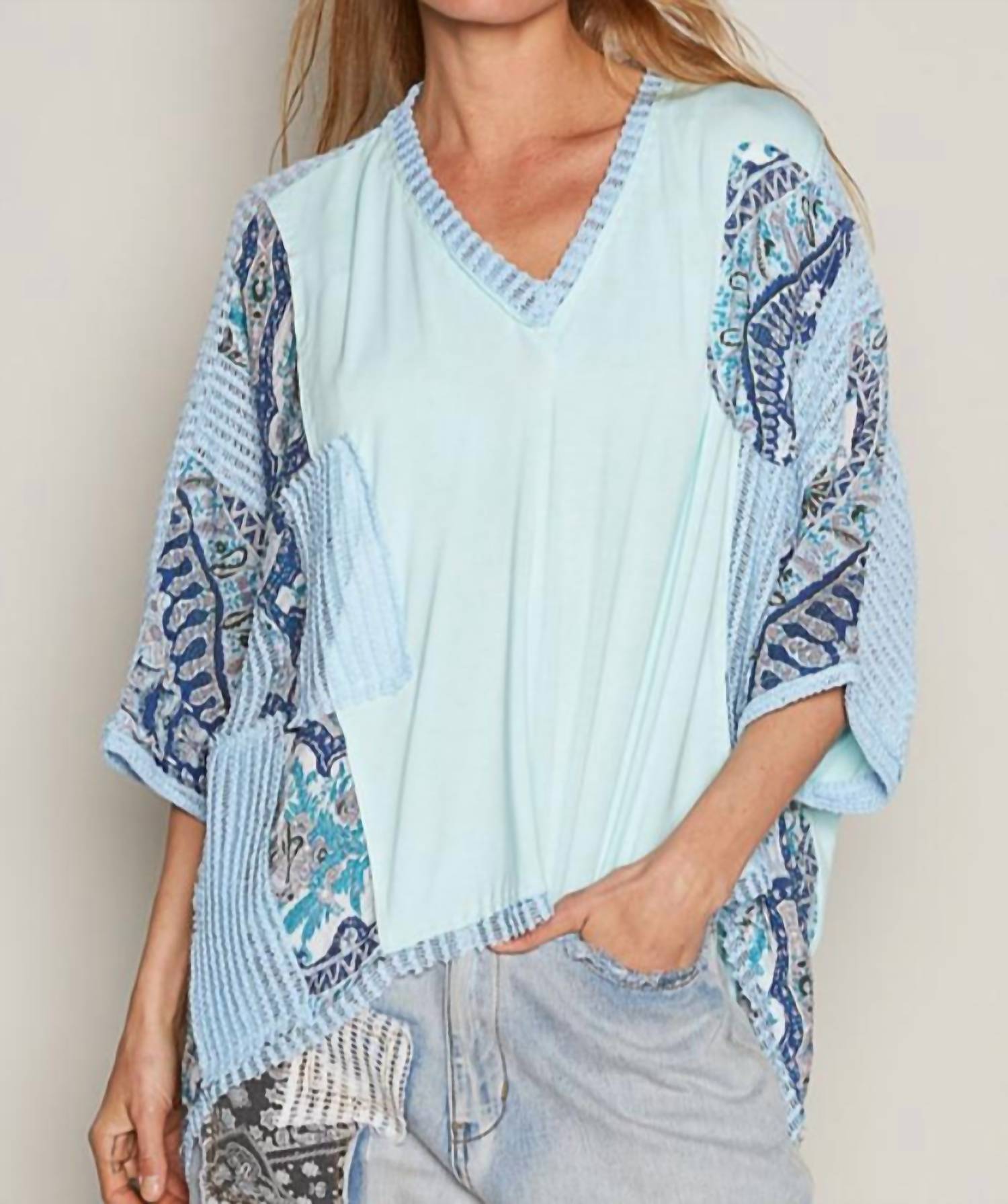 This classic, short sleeve tee will be your go-to staple this season and beyond. Mixed media vee neck shirt with mesh and print patchwork. Shirt is very oversized and longer in the back