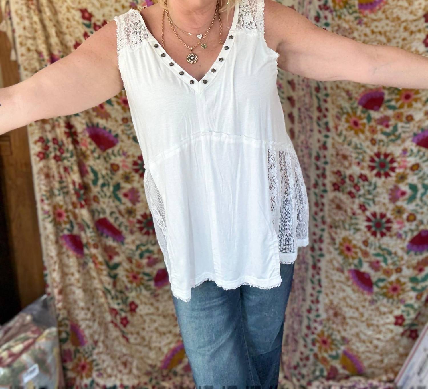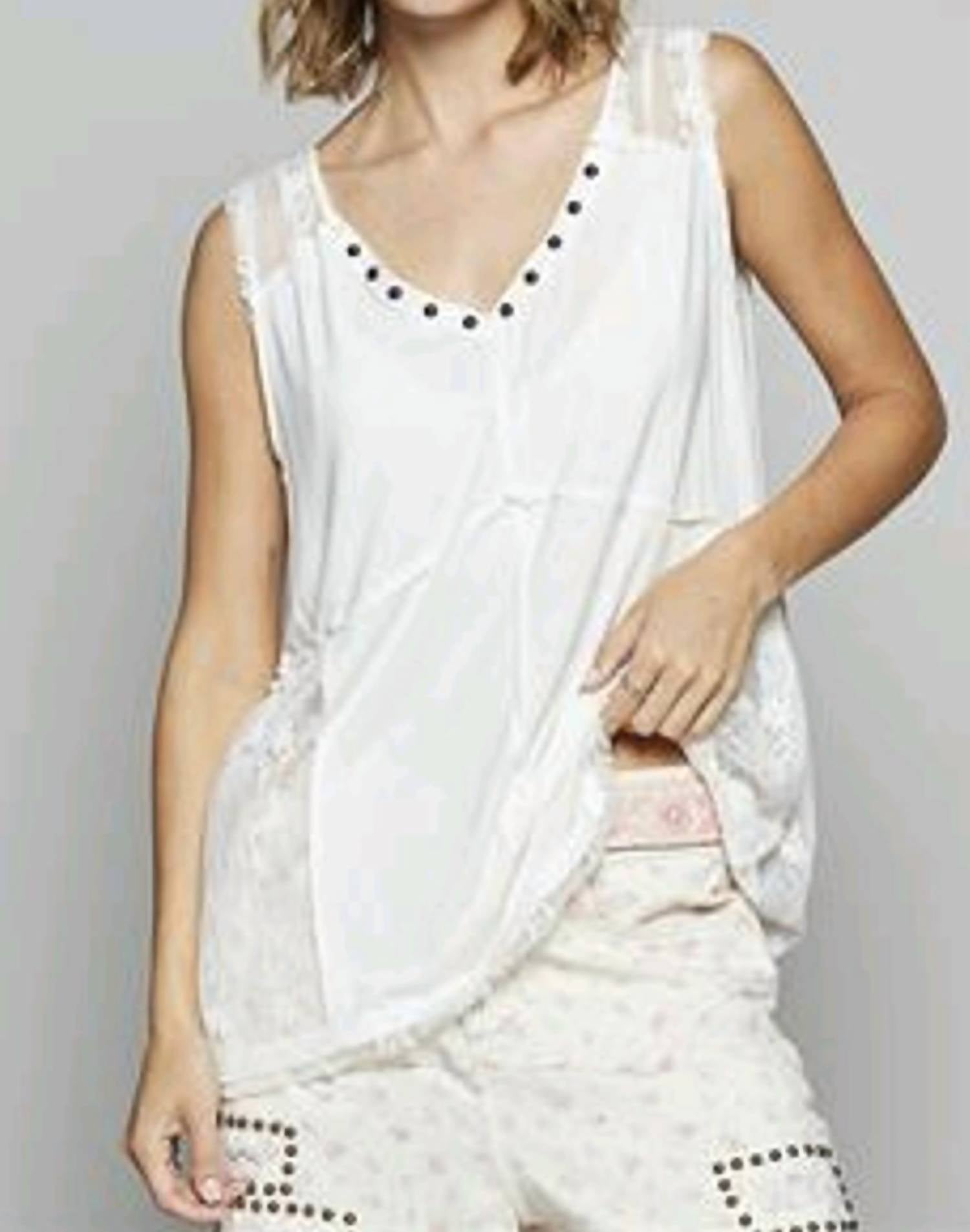 This classic tank top is perfect for layering and cute enough to wear on its own. Introducing the Not So Basic Tank by POL, a chic addition to your summer wardrobe in solid off-white. This sleeveless top is crafted from 94% Rayon and 6% Spandex, with contrast detailing of 60% Cotton and 40% Nylon. It features a flattering V-neckline adorned with delicate buttons and intricate lace detailing on the shoulders for a feminine touch. With a relaxed fit, this tank top offers breezy comfort, perfectly paired with your favorite seasonal pieces. Available in sizes S, M, and L with bust measurements of 20", 21", and 23" respectively.