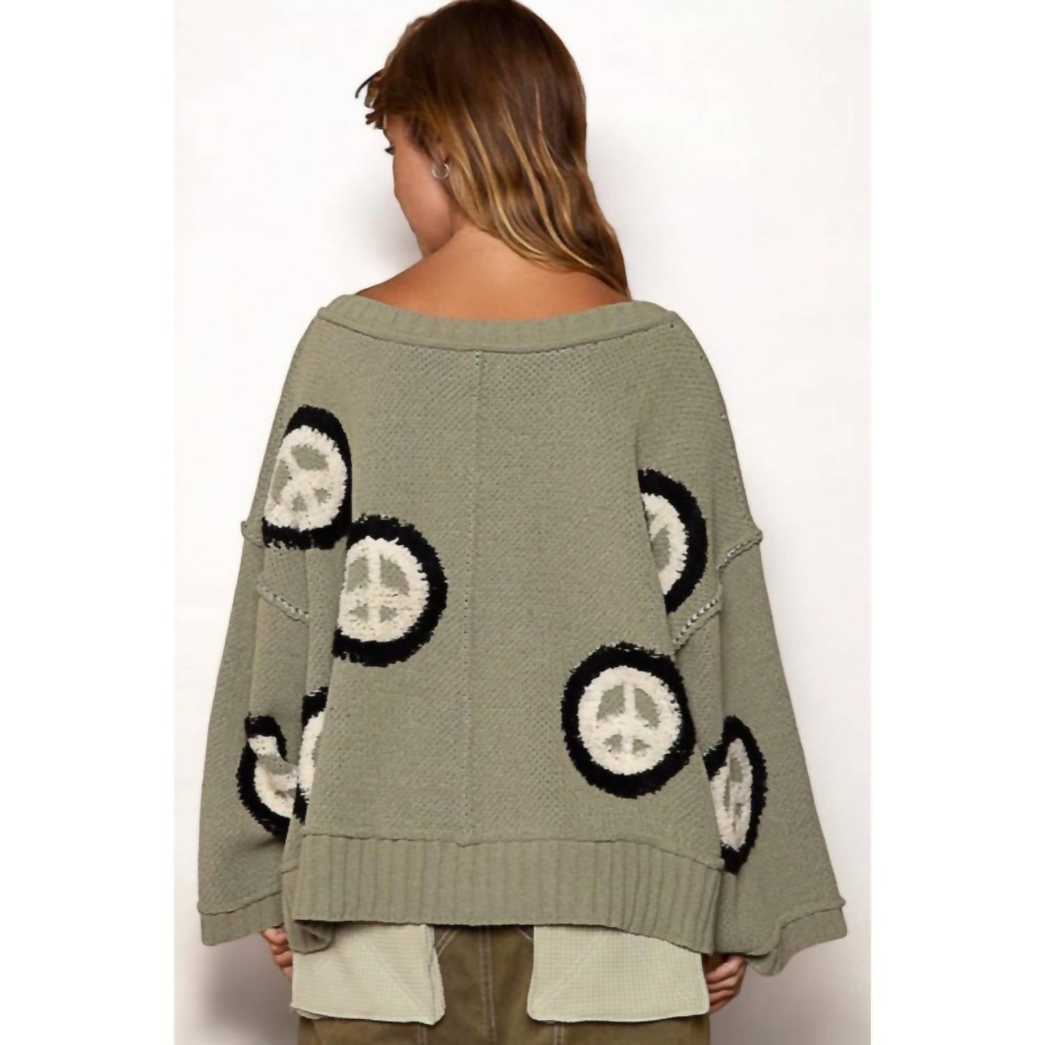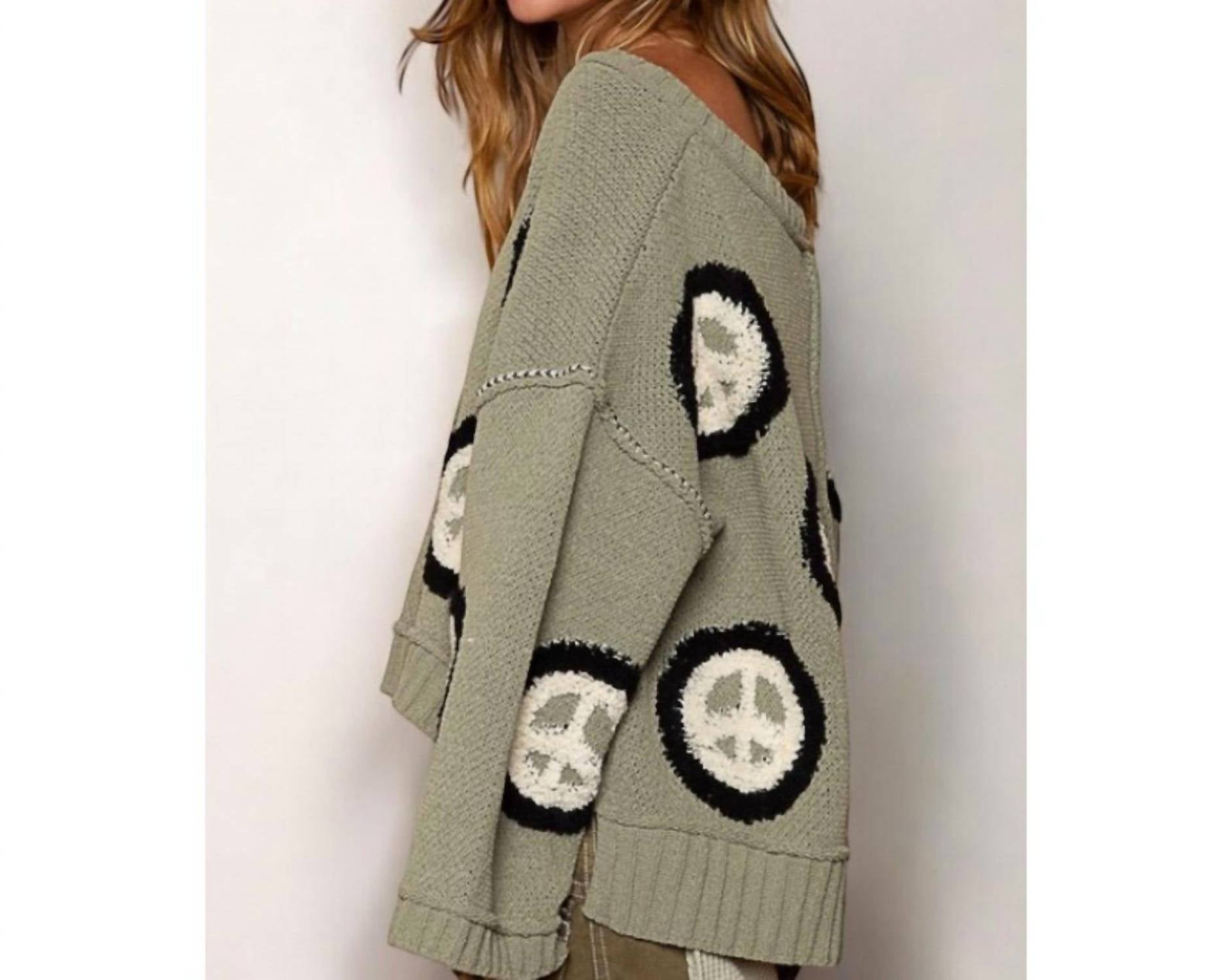 Wear this v-neck sweater with your favorite denim for the perfect fall look. Embrace tranquility with the Oversized Peace Sweater by POL, offering a serene vibe in olive green. This sweater boasts a comfortable oversized fit and long sleeves, making it ideal for chilly days. Features a stylish V-neckline and a distinctive graphic pattern. 100% Polyester.Small: Bust 54” Length 22 3/4” Sleeve Length 17”Med: Bust 56” Length 23 1/4” Sleeve Length 17.5”Large: Bust 58” Length 23 3/4” Sleeve Length 18”