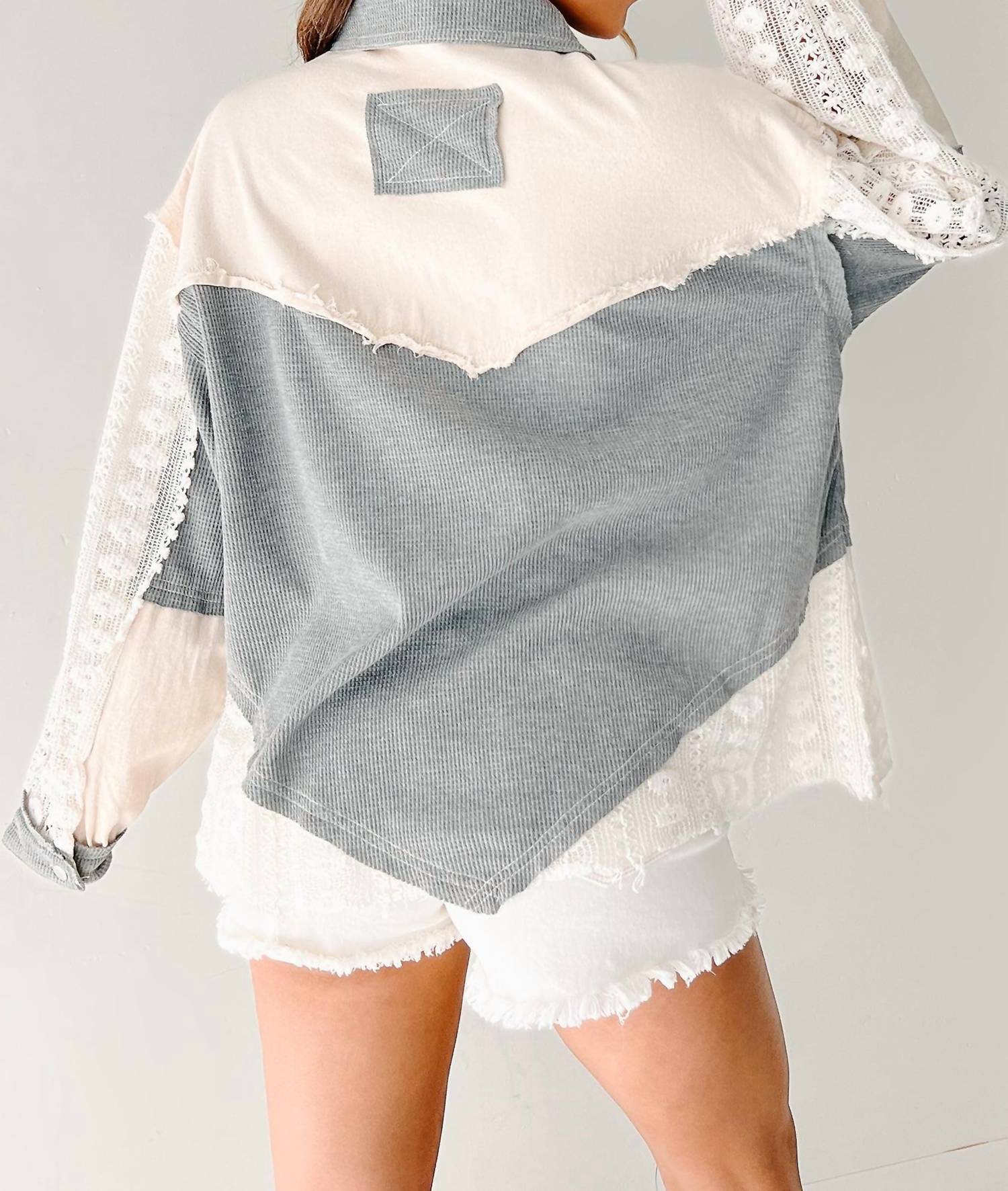 A versatile blouse that works from desk to dinner! Introducing the Sweet Memories Button Down Top by POL, a chic and versatile blouse in Cream Grey perfect for travel or casual outings. This long-sleeve top is crafted from a comfortable cotton blend, comprising 68% cotton and 32% polyester, and features a stylish mix of textures with intricate lace detailing. It comes with a classic collar, button closure, and practical pockets, adding sophistication to its design. Care: Machine wash cold, lay flat to dry, cool iron, do not bleach. Available in sizes S (Shoulder 22", Bust 24", Length 26", Sleeve 20"), M (Shoulder 22.5", Bust 25", Length 27", Sleeve 20"), and L (Shoulder 23", Bust 26", Length 27.5", Sleeve 21").