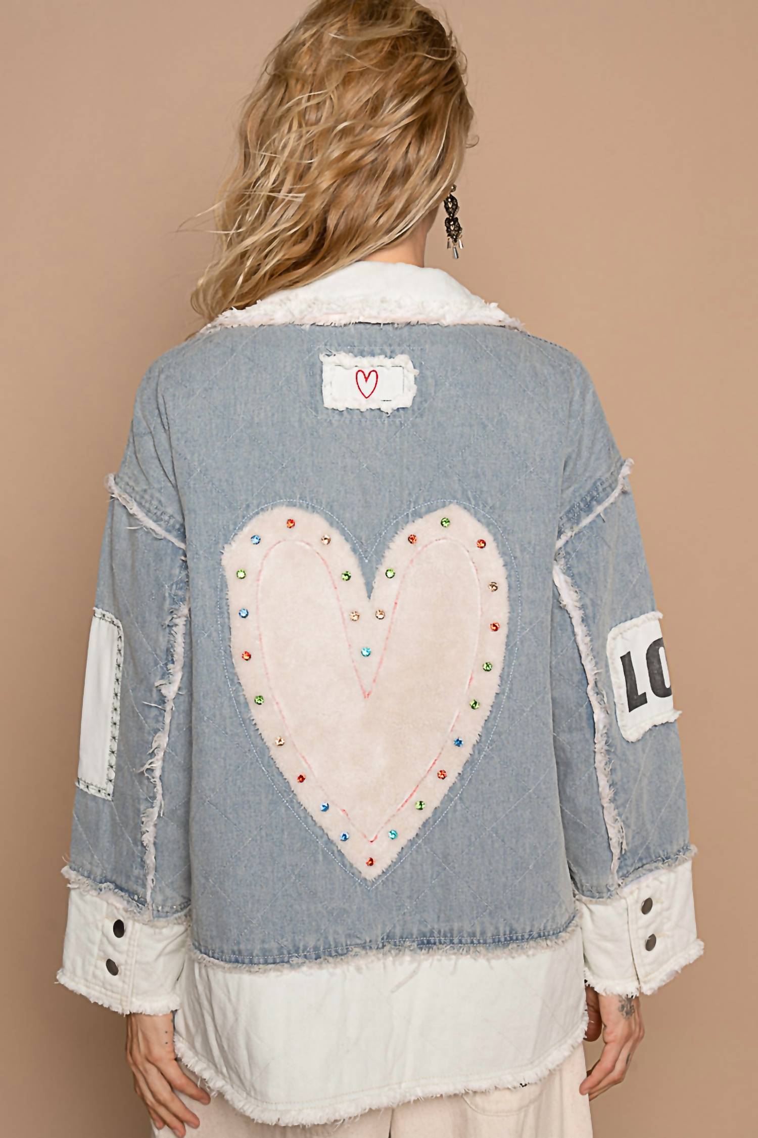 Nothing is cooler than this vintage inspired bomber jacket. Designed in long sleeve roomy jacket top in twill with quilting detailing, color blocked twill patch, embroidery point, back heart patch, stud detailing, raw edge, out seam detailing, vintage washing, solid color. Specs/Dimensions: - BUST: 25" - LENGTH: 27-1/2" - SHOULDER: 23-1/2" - SLEEVE LENGTH: 19 -1/2"