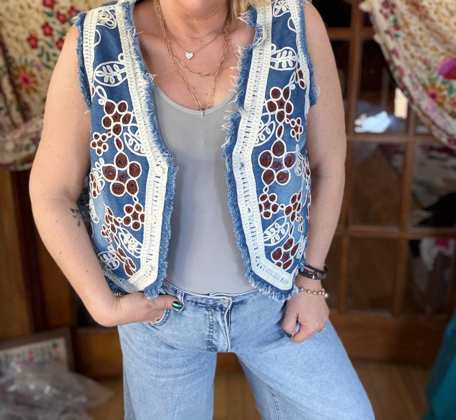 A vest so versatile you can mix and match it with almost any outfit and it will feel brand new every time. Introducing the Yeehaw County Vest by POL, a sleeveless must-have that combines casual chic with artistic flair. Made from a cotton blend, this vest features a vibrant floral embroidery against a blue denim backdrop, enhancing the multi-colored visual appeal. Its dimensions are Shoulder 16", Bust 20.5", and Length 21", offering a relaxed fit perfect for layering. Ideal for summer vacations, this piece is designed with frayed edges and a V-neckline for a trendy touch to your wardrobe.