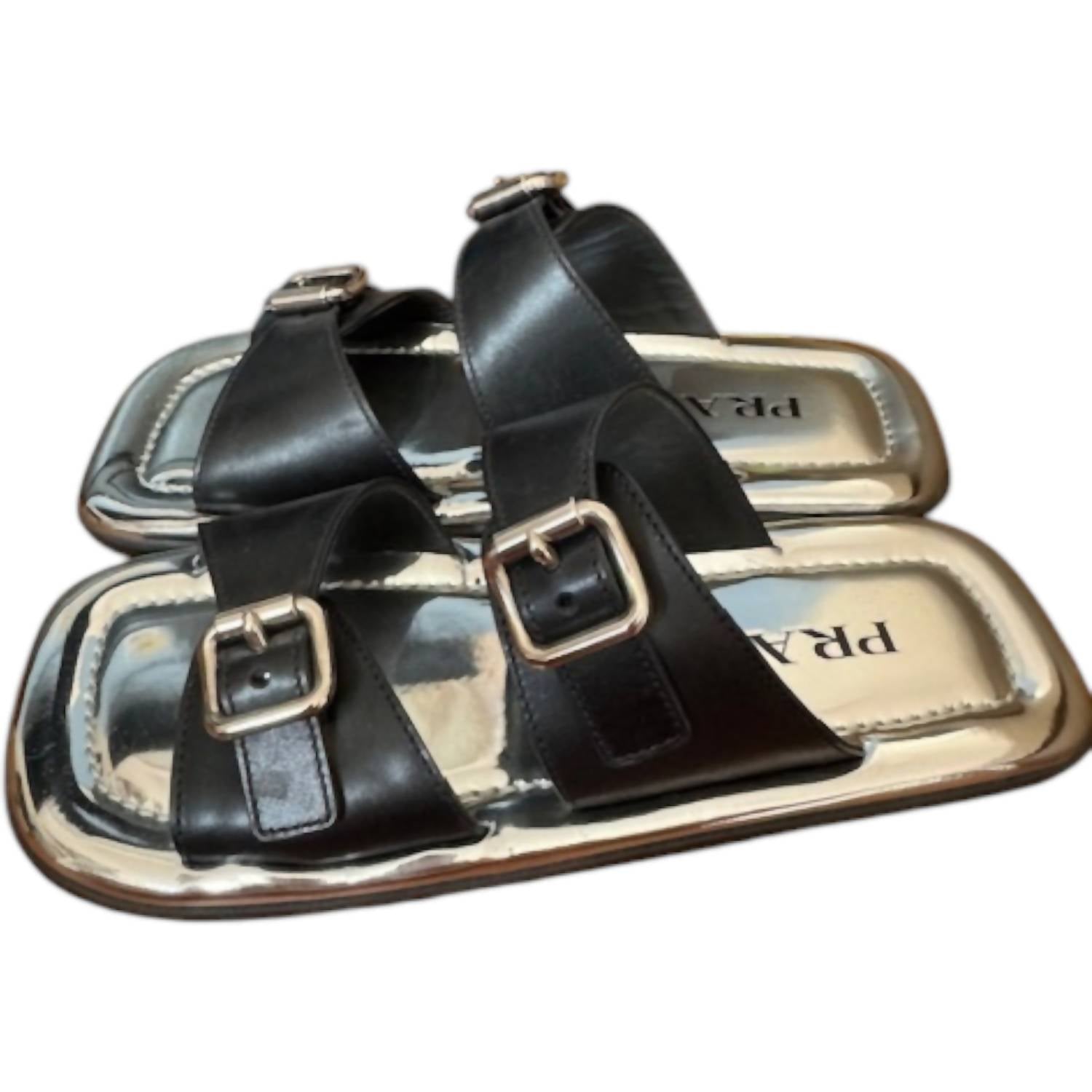 This sandal will take you from brunch to dinner and everything in between. Must-have for your streetwear collection, designed with clean, contemporary lines and sporty details. Black leather sandals feature an open toe and flat heel, characterized by their double-strap design with buckle closures and a rubber lug sole. Offers a luxurious touch with a branded footbed, perfect for a casual beach day. Enjoy the unparalleled style synonymous with Prada.
