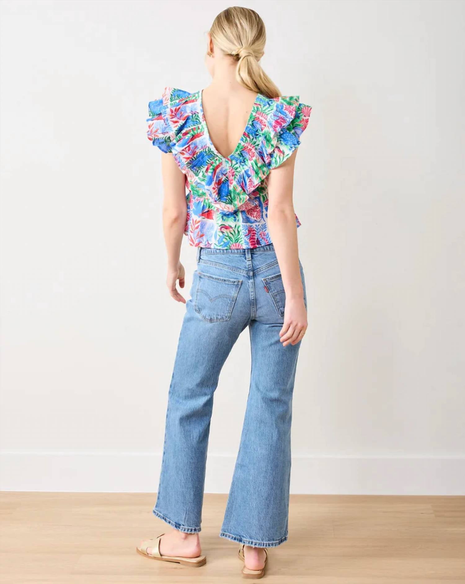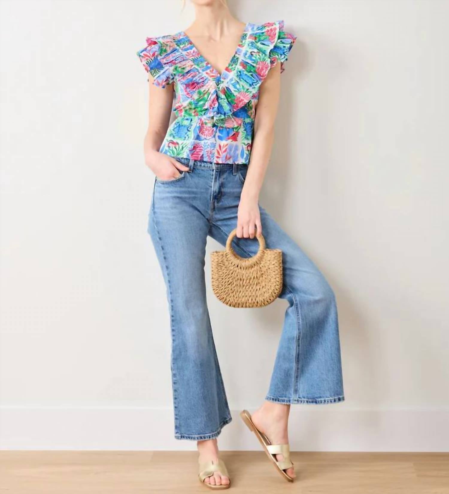 A versatile blouse that works from desk to dinner! Embrace bohemian elegance, featuring playful full flutter cap sleeves and a vibrant patterned design. Crafted from 100% organic cotton cambric. Multicolor piece is lovingly designed in Philadelphia and hand screen-printed by artisans in India, highlighting both style and artisanal craftsmanship. Enjoy the ease of its pull-on closure and the standout V-neckline perfect for holiday parties. Machine wash for effortless maintenance.