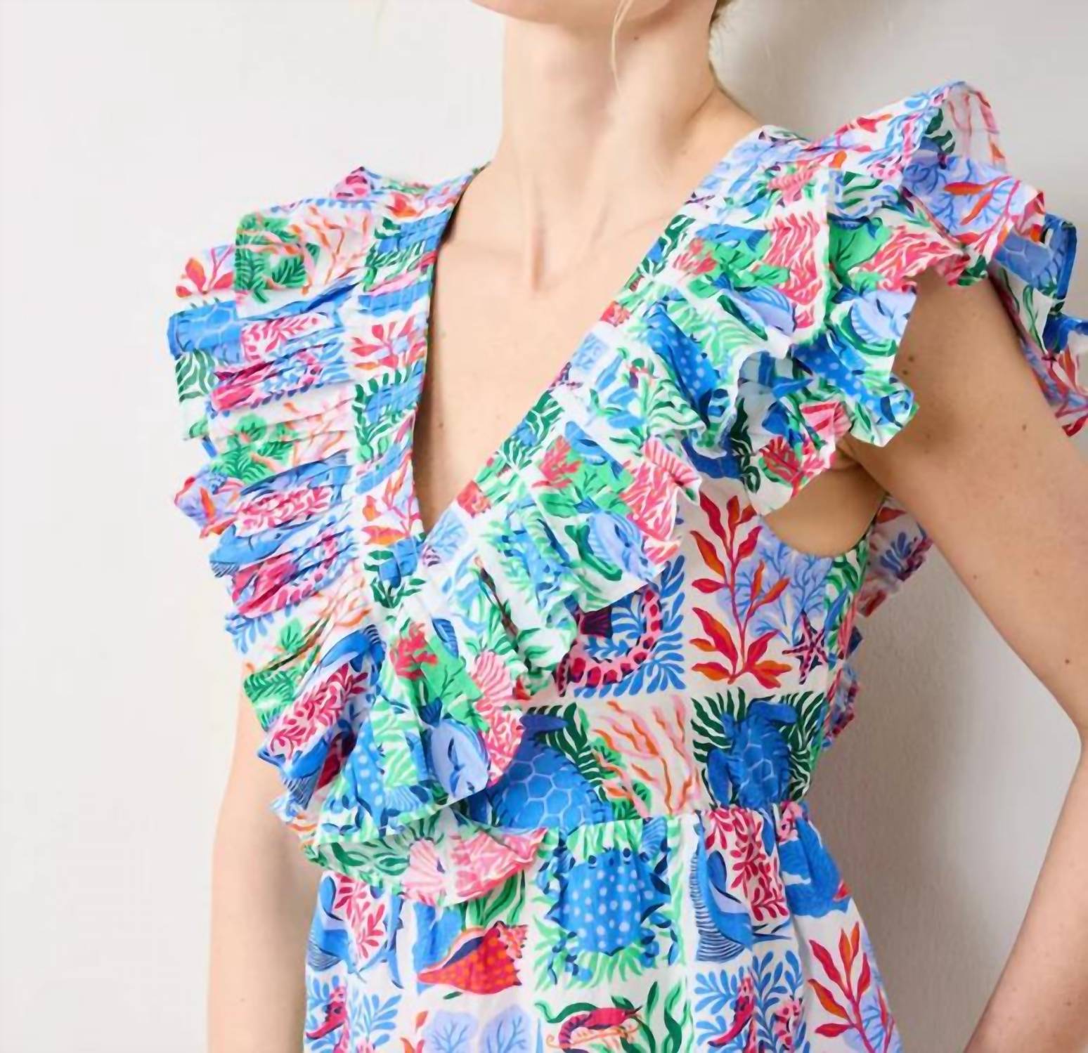 Embrace bohemian elegance, featuring playful full flutter cap sleeves and a vibrant patterned design. Crafted from 100% organic cotton cambric. Multicolor piece is lovingly designed in Philadelphia and hand screen-printed by artisans in India, highlighting both style and artisanal craftsmanship. Enjoy the ease of its pull-on closure and the standout V-neckline perfect for holiday parties. Machine wash for effortless maintenance.
