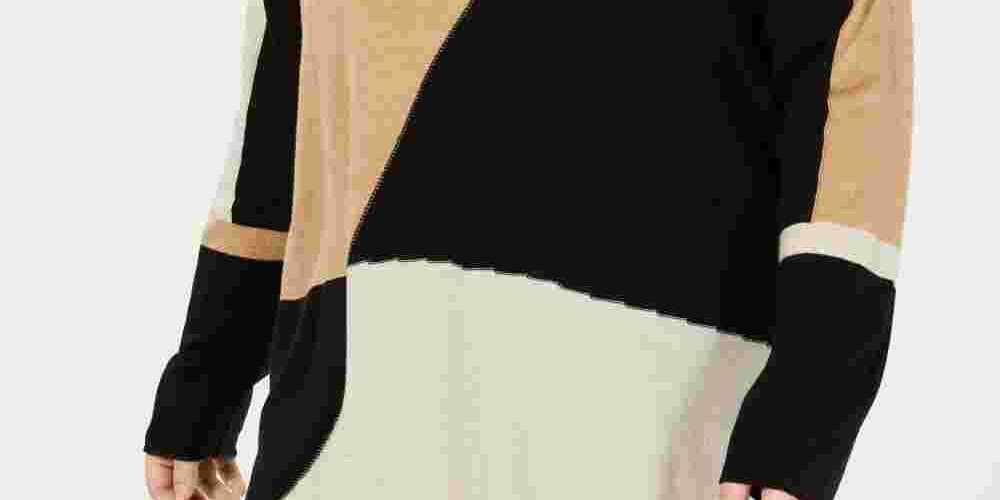 Scoop neckline|Curved high-low hem|Loose fit; hits below hip|Acrylic/nylon/wool