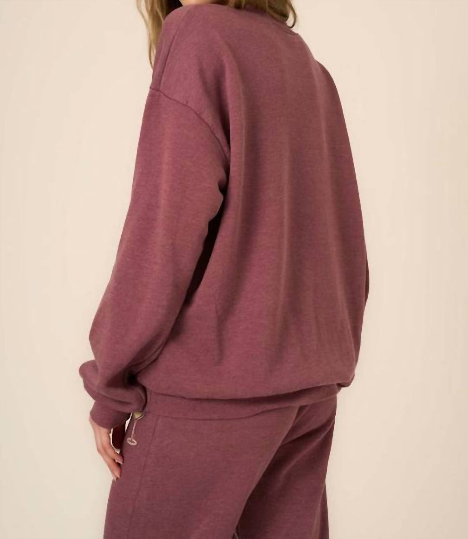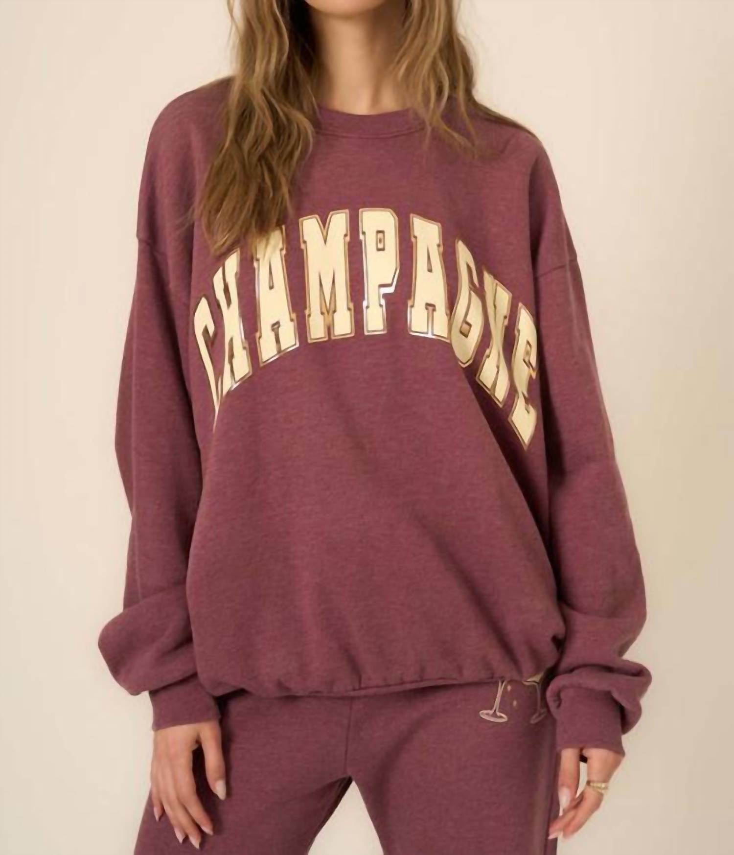 Experience the perfect blend of comfort and style with this trendy crew neck sweater, designed to effortlessly elevate your wardrobe. Pair it with your favorite denim and loafers for the perfect look. Elevate your wardrobe with the Champagne Foil Sweatshirt by Project Social T, a standout piece in a Merry Merlot hue. This women's crewneck features long raglan sleeves and a screen-printed foil graphic that adds a touch of flair. Composition: 50% Cotton, 50% Polyester. Closure: Pull-on style. Care: Machine wash cold inside out with similar colors, do not bleach, lay flat to dry, and cool iron if necessary, avoiding the graphic. Measurements for size S: 27" front length from shoulder, 23" chest, relaxed fit. Model Ari is wearing a size small (5'9", Bust 33", Waist 23", Hips 35").