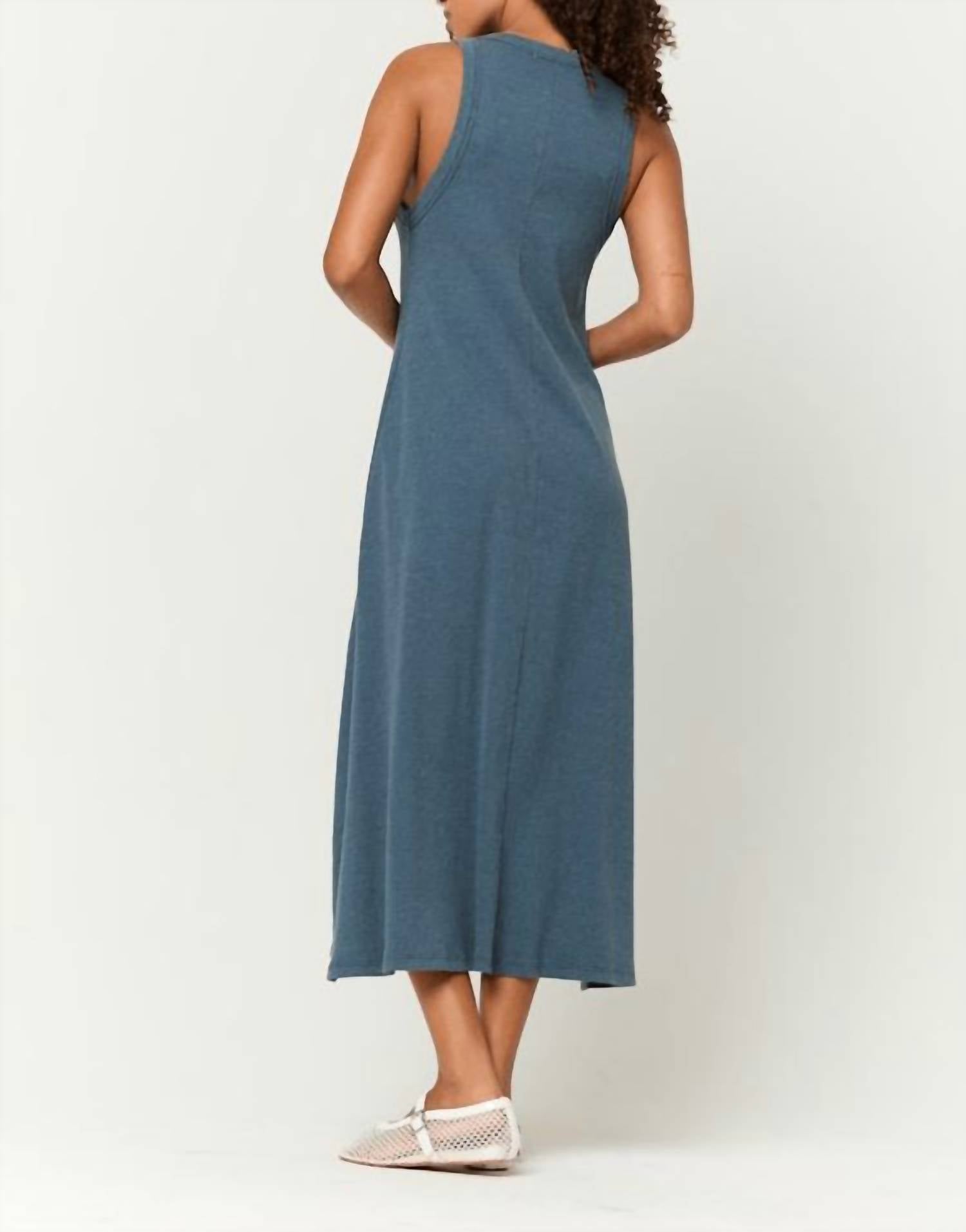 Introducing the Yuma Scoop Neck Rib Tank Dress by Project Social T, a summer-ready staple in a solid Blue Pine hue. This sleeveless dress features a flattering shirt silhouette and a bra-friendly scoop neckline, offering both comfort and style. It is crafted from ribbed material with a poplin skirt, draping gracefully to a midi length for a polished vacation look. With its versatile design, this piece effortlessly transitions from day to night.