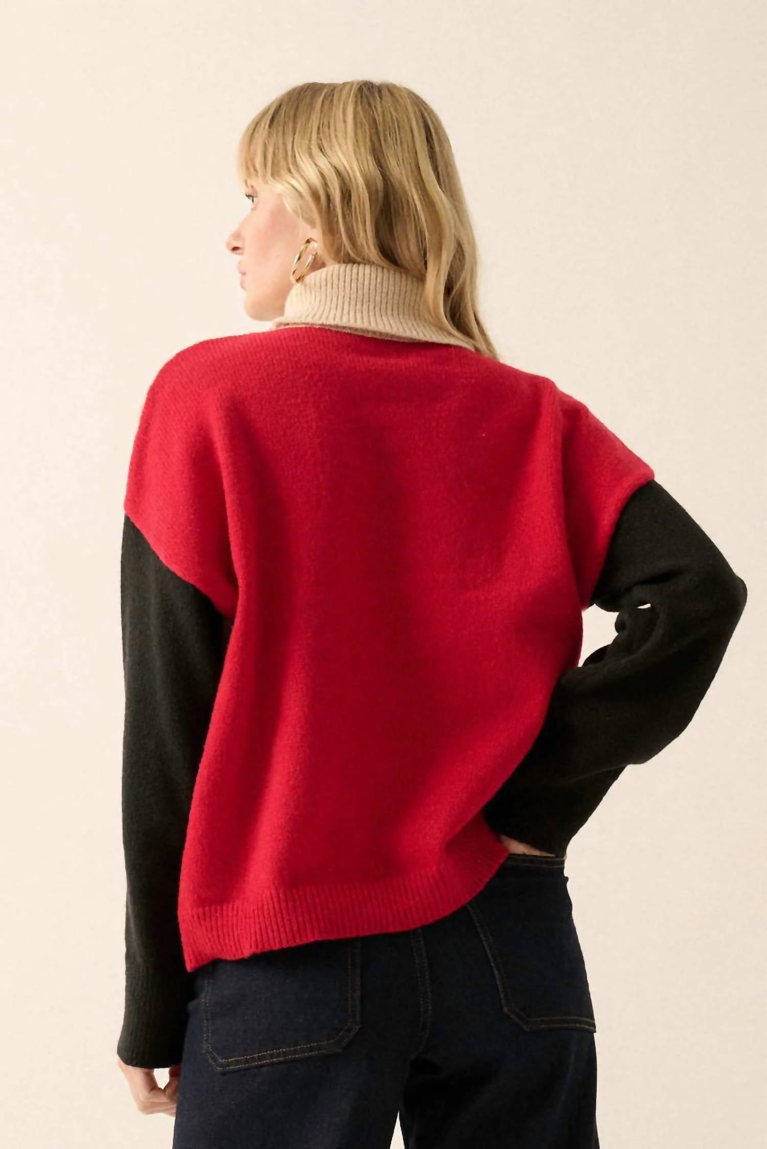 Layer under your favorite sweater or wear tucked into jeans for a perfectly polished winter look. Wrap yourself in comfort with this cozy sweater, styled with a cable knit front and contrasting sleeves and back for a bold touch. It features a high turtleneck, dropped shoulders, and ribbed details on the collar, cuffs, and hem. Crafted from 100% polyester, it offers a soft, relaxed fit perfect for everyday wear.