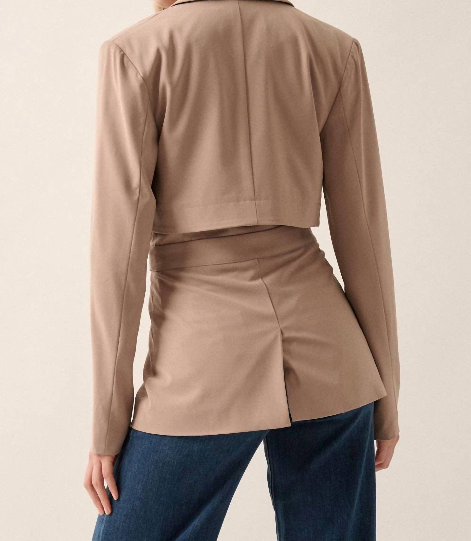 A blazer so versatile you can wear it to the office or pair it with jeans for a more casual look. Introducing the Courtney Blazer by PROMESA, crafted for the discerning woman in a sophisticated taupe hue. This thigh-length blazer, made from luxurious Polyester, features long sleeves and a notch lapel collar for an elegant fit. With a tie closure and matching fabric belt, it ensures a refined silhouette, enhanced by its solid woven design. Care for this lined piece by machine washing and laying it flat to dry. Model is 5'9.5" with measurements 33" bust, 24.5" waist, 37" hips and is wearing a size S.