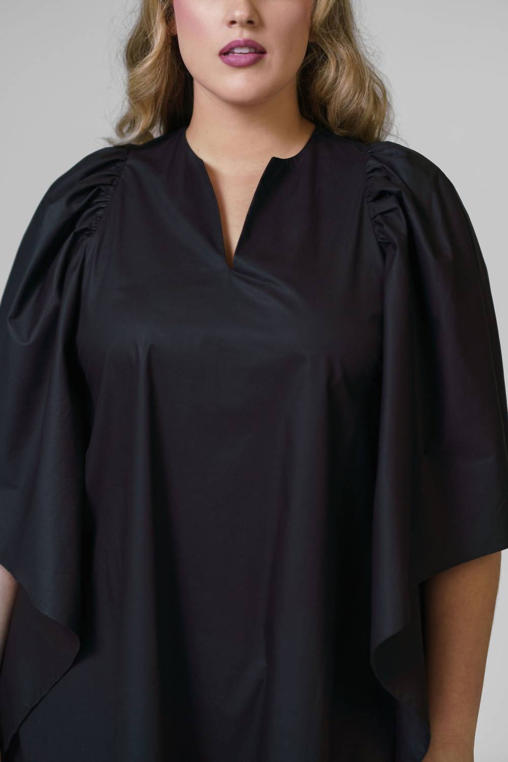 A short and breezy dress for those warmer days. Discover the Mini Swing Tunic by Psophia, an artistic creation in solid black for the effortlessly chic. Featuring elbow sleeves and a split V-neckline, this A-line design offers wide sleeves and a wide body for comfortable movement. Crafted for versatility, it can be worn as a dress or paired with jeans for a sophisticated look. Closure: Pull on.