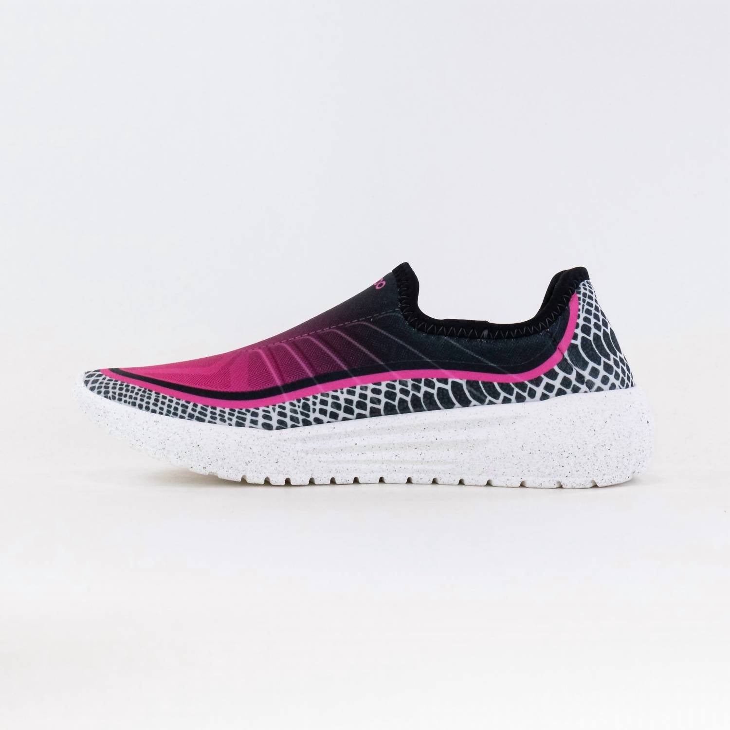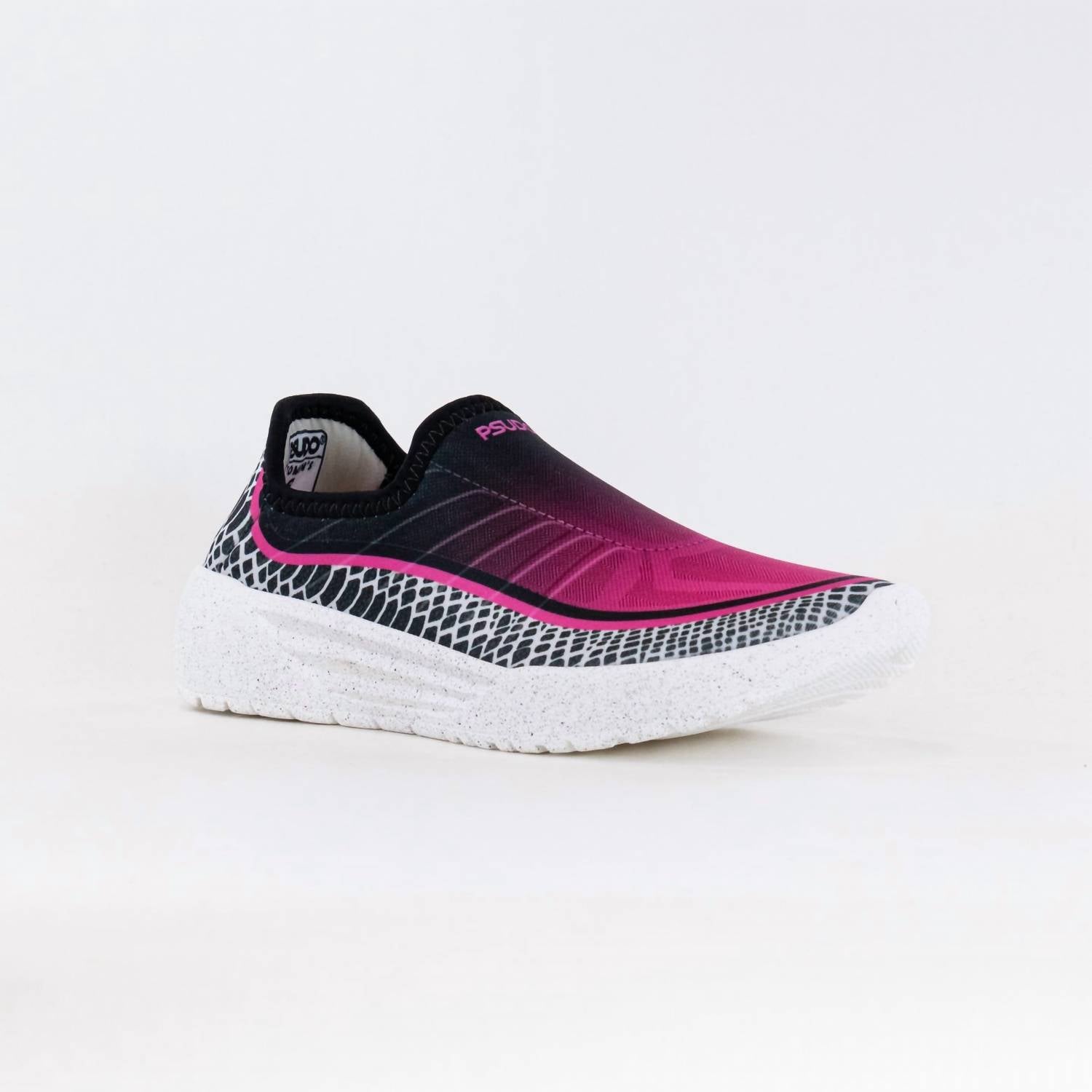 Stylish, comfortable and supportive. These athletic sneakers check all of the boxes. Step up your style game with the Women's Racer Sport Shoes by PSUDO, a blend of comfort and sustainability. These eco-friendly slip-on sneakers in a vibrant pink and smoke color are crafted with Repreve and nylon, ensuring breathable, sweat-wicking comfort. Made in the USA, they feature anatomically correct arch support, anti-microbial insoles, and are designed for fitness or workout occasions. With their round toe and flat heel, these shoes are perfect for athleisure trends and can be machine washed for easy care.