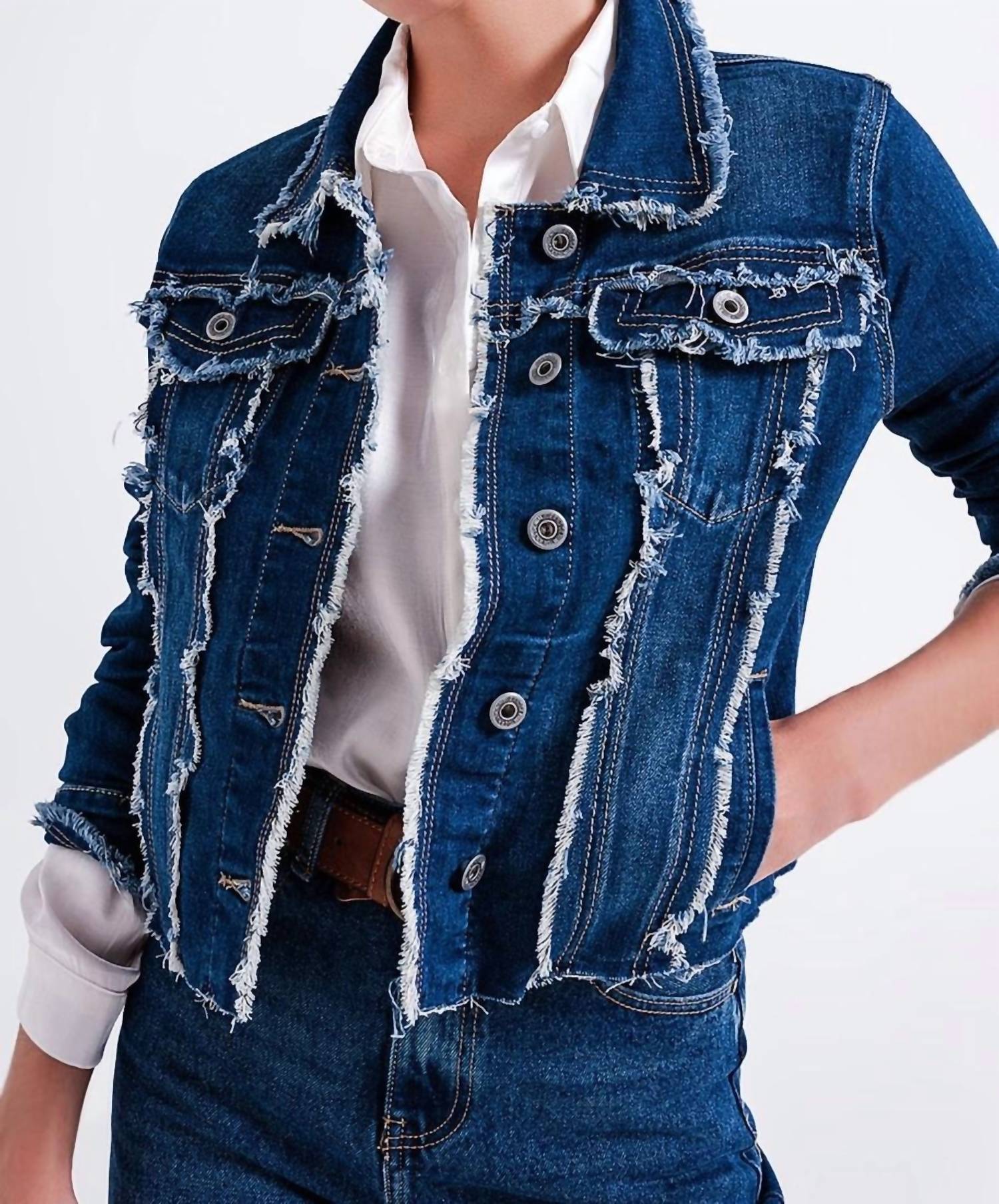 Crafted from a sturdy cotton blend, this blue jean jacket features long sleeves and a classic collar with a chic frayed design. It boasts a practical button closure with ample pocket space for everyday essentials. Made in China.