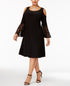 Dazzling lace trims the pretty bell sleeves on R & M Richards' plus size formal frock| while cold-shoulder cutouts finish the look with fabulous flair.| The Statement Bare Shoulder featured on The It List| Lace trim with sequin embellishments at sleeves| Knee length| Scoop neckline| Bell sleeves with cold-shoulder cutouts