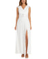Have your moment in the spotlight with this stunning plus size gown from R & M Richards| showcasing a metallic finish.| Floor-length formal dress| Surplice neckline; Gown silhouette| Hidden back zipper closure| Embellished at waist; slit at front| Lined