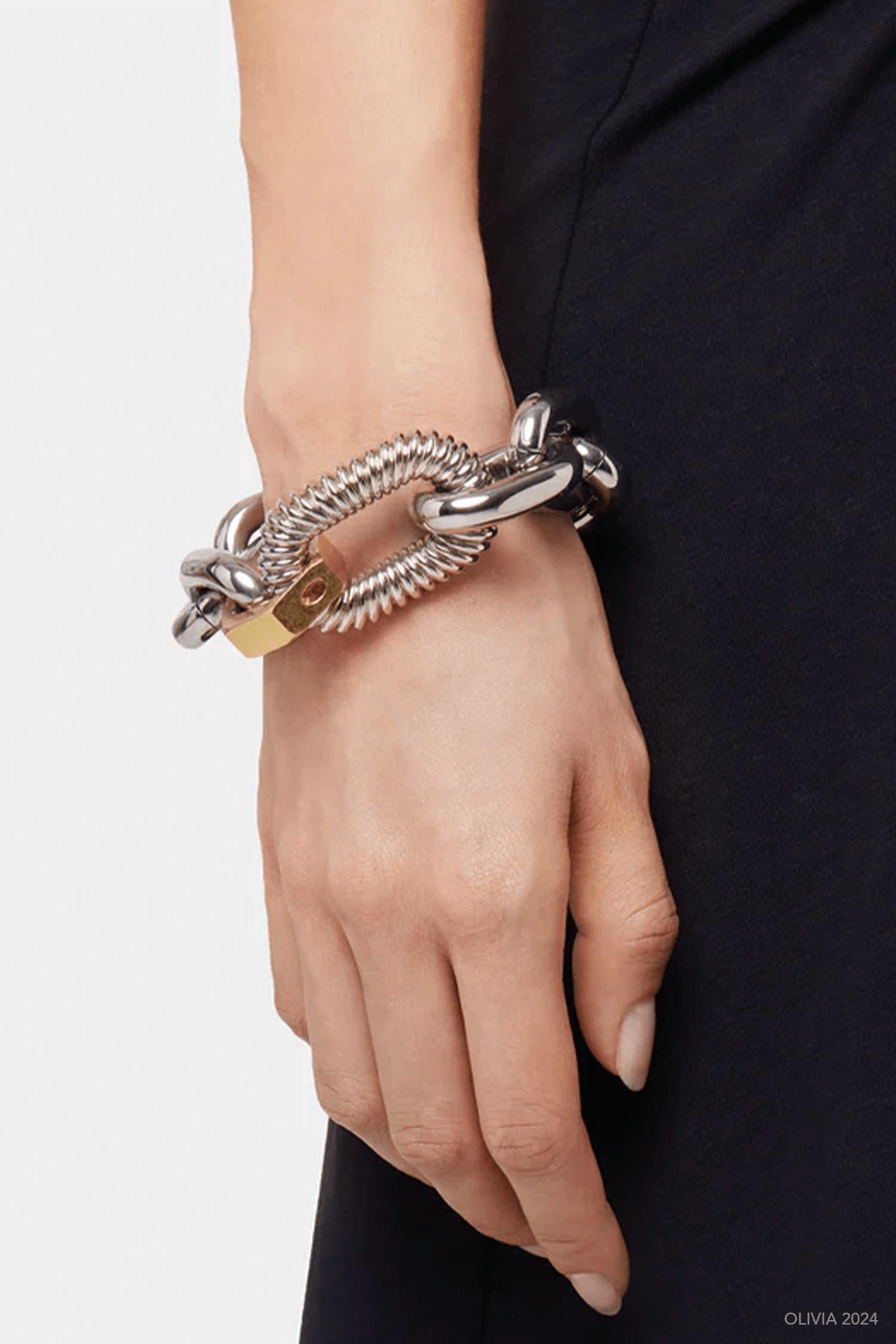 Stacked or solo - you can't go wrong with this bracelet. Introducing the Women's XL Link Animation Godron Bracelet by Rabanne, a fine piece that exudes elegance with its two-tone silver and gold design. Crafted in Italy from brass and featuring oversized chain-link detailing with hexagonal and embossed elements, this bracelet offers a polished finish for a sophisticated look. Its T-bar toggle closure ensures a secure fit, while the engraved logo adds a touch of refinement. This exquisite piece is designed in a one-size-fits-all model.