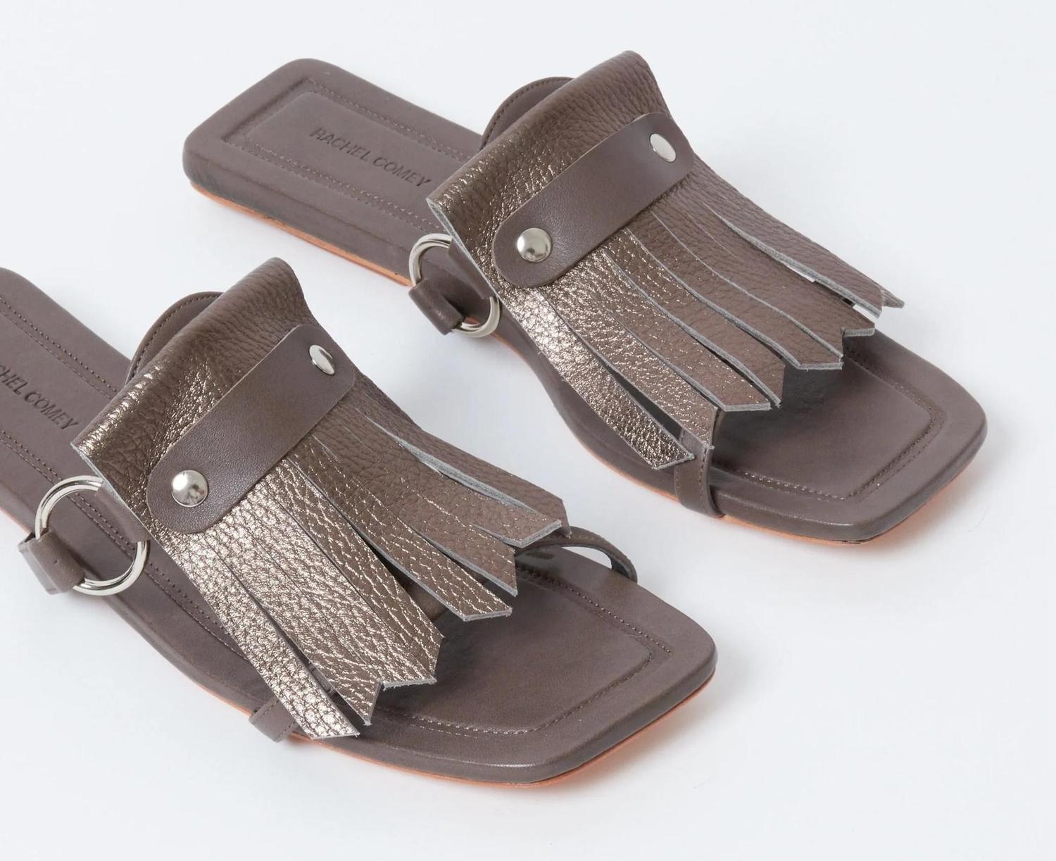 Step into summer with the Women's Fitz Sandal by RACHEL COMEY, a minimalist option for a chic vacation look. These flat sandals feature an open square toe with fringe detailing and metal ring accents along the sides, all crafted from 100% leather. Made in Peru, they offer a style-conscious choice for the fashion-forward adult. Ideal for summer outings, this taupe sandal is a must-have for your wardrobe.
