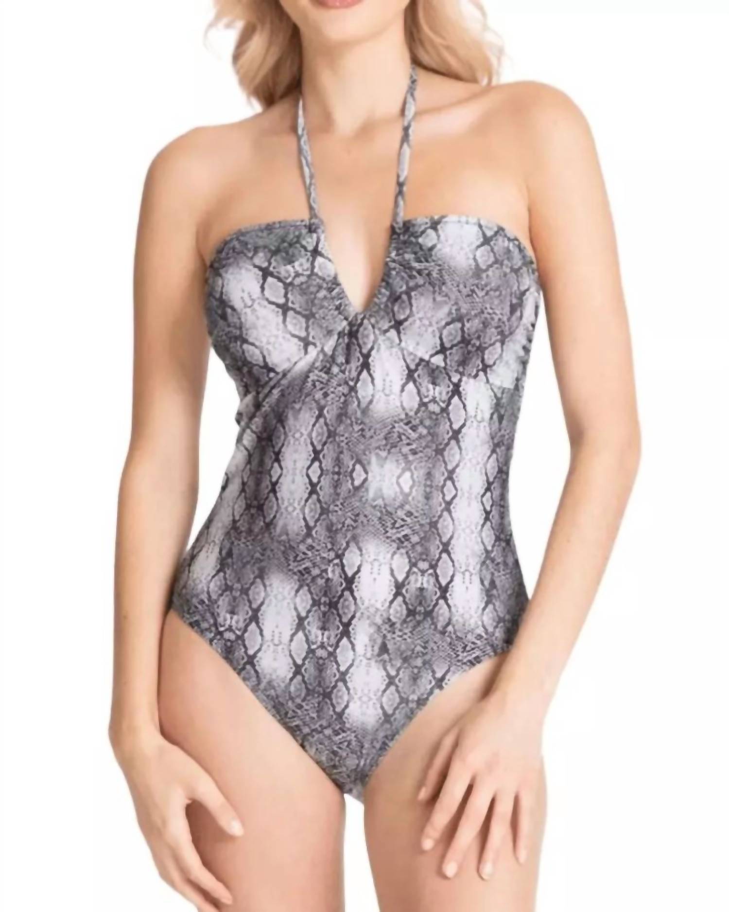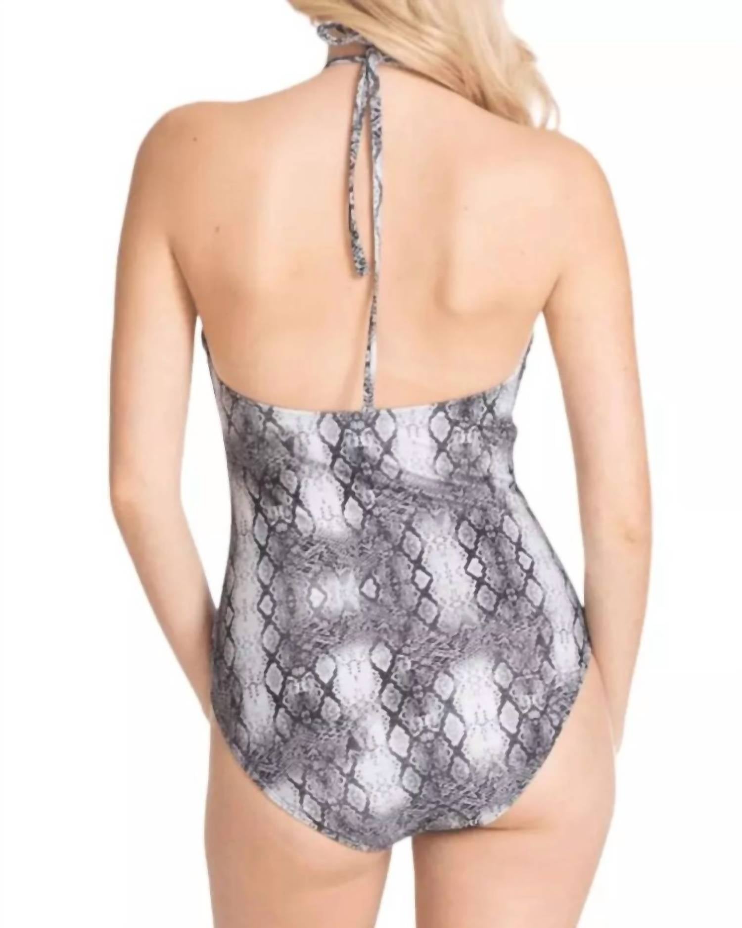 Halter neck design with a tie closure. Snake print pattern. Strapless bodice with a twisted front detail. Moderate back coverage.