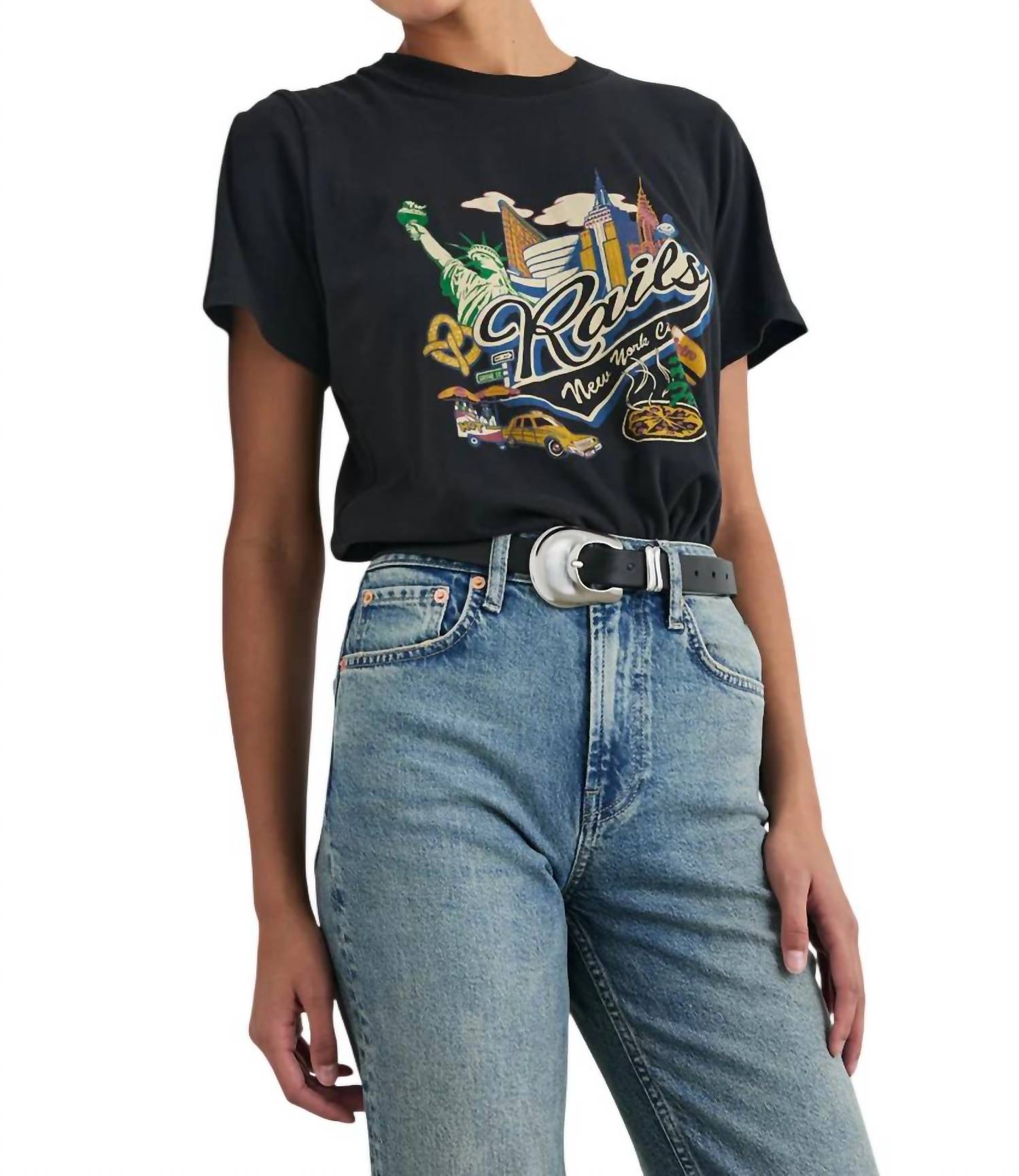 This classic, short sleeve tee will be your go-to staple this season and beyond. A graphic tee in a boyfriend-style fit, featuring a Rails New York print. Made from 100% cotton, with a front body length of 24 3/4" (measured from size Small). Machine wash cold. Recommended to order true to size.