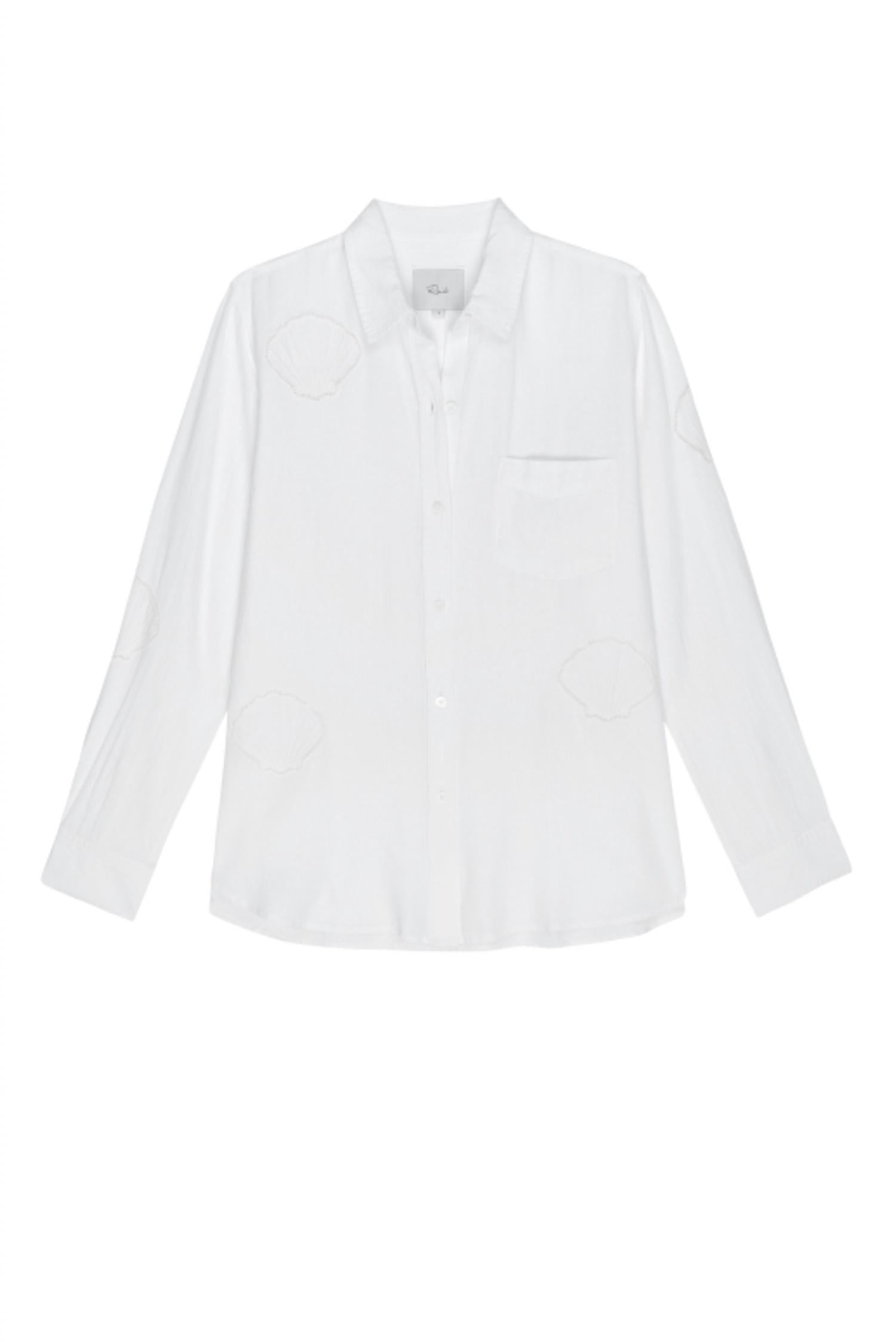 This Rails Charli Top combines the lightweight comfort of linen with a playful eyelet shell print. Featuring a convenient front pocket and long sleeves, this top is both stylish and practical. Perfect for a day at the beach or a casual lunch outing.
