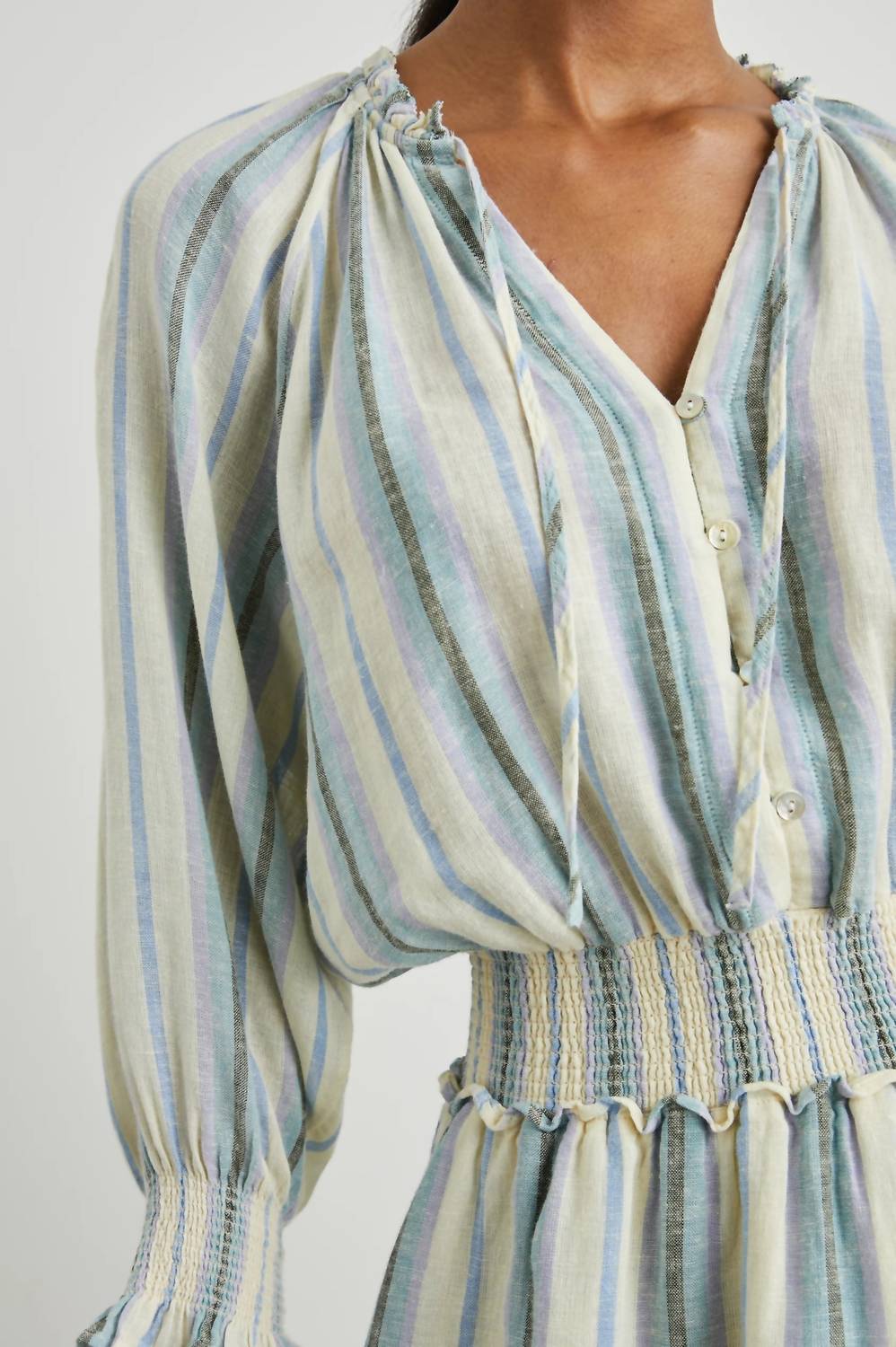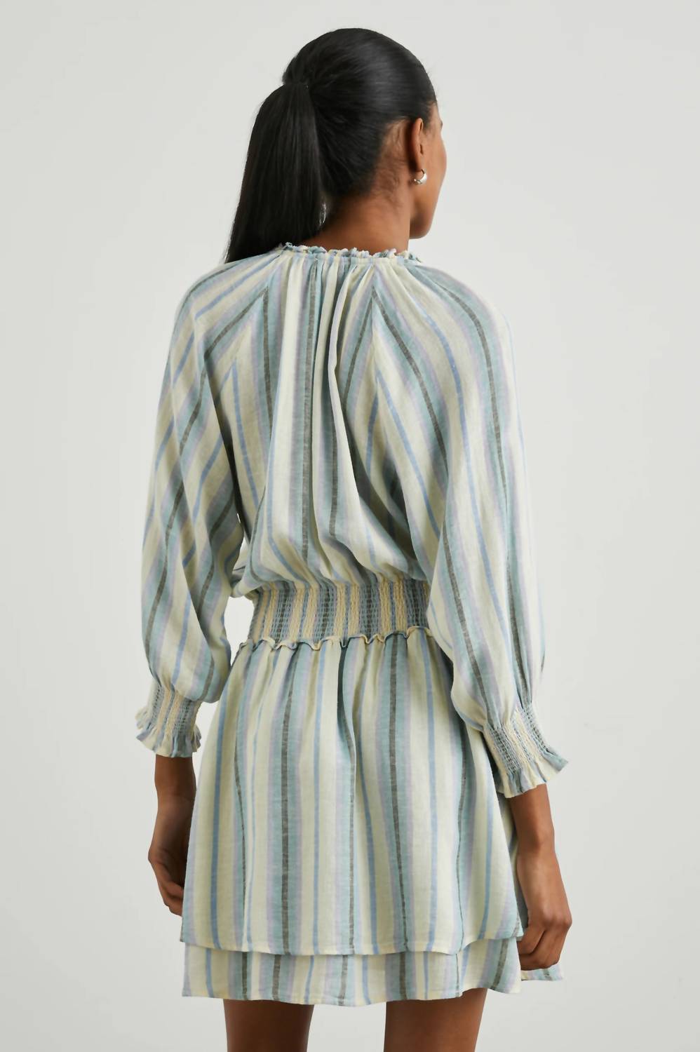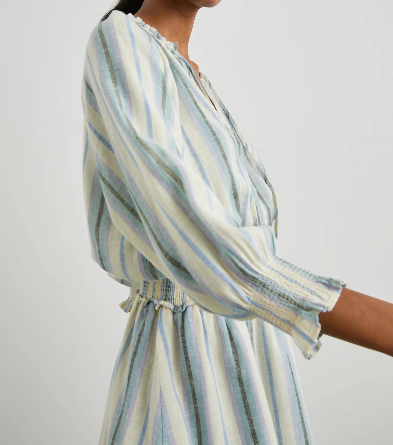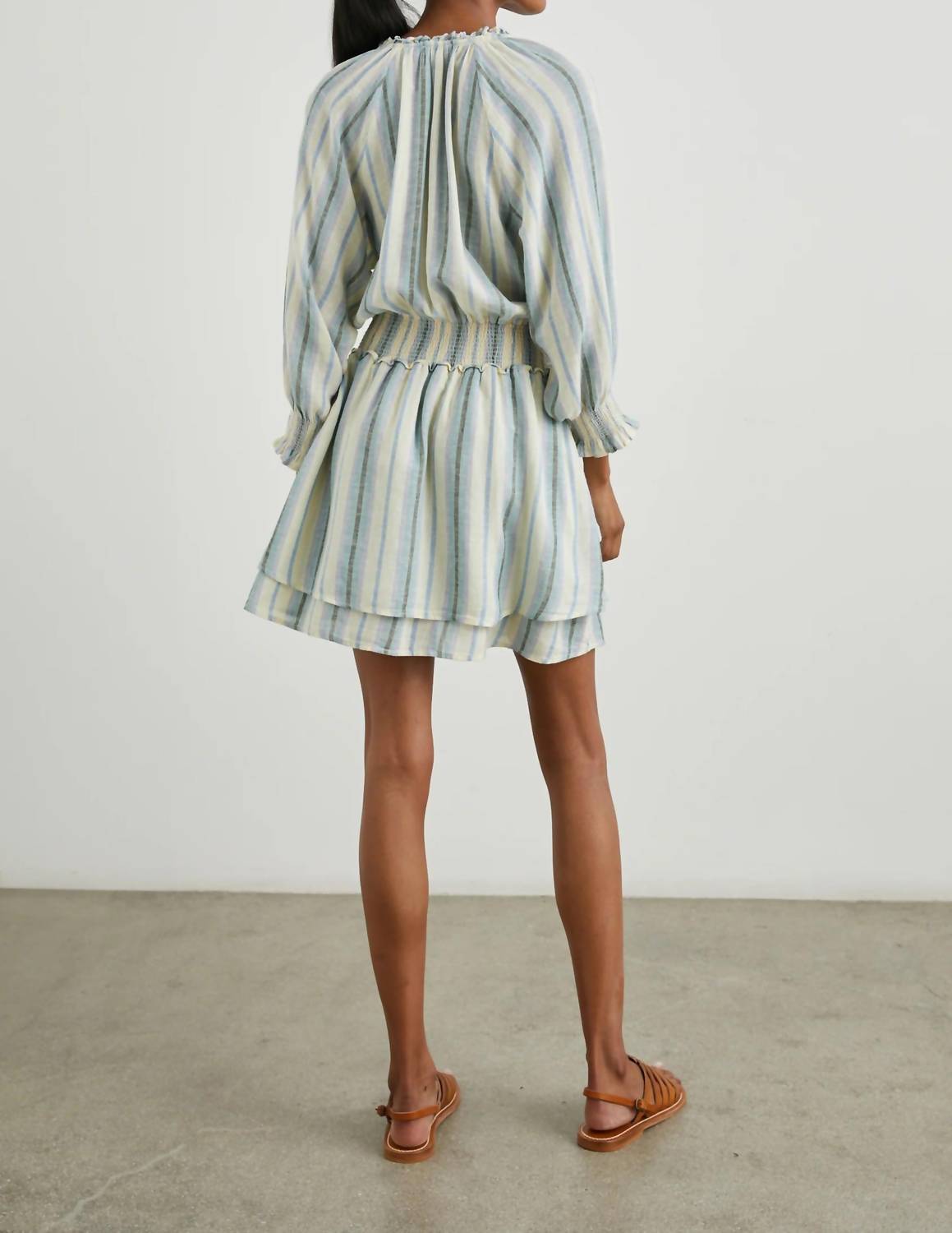 Discover the Crystal Mini Dress by Rails in a chic Catania Stripe, crafted for timeless elegance. This dress boasts three-quarter sleeves and a flattering v-neckline with functional button closure, leading to a cinched waist and a tiered mini skirt. Made from a luxe blend of 55% Linen and 45% Rayon, it offers comfort and style. Measuring at a front body length of 35.75 inches, it is imported and recommended to order true to size. Care for this piece with hand washing, laying flat to dry, and a cool iron if necessary.